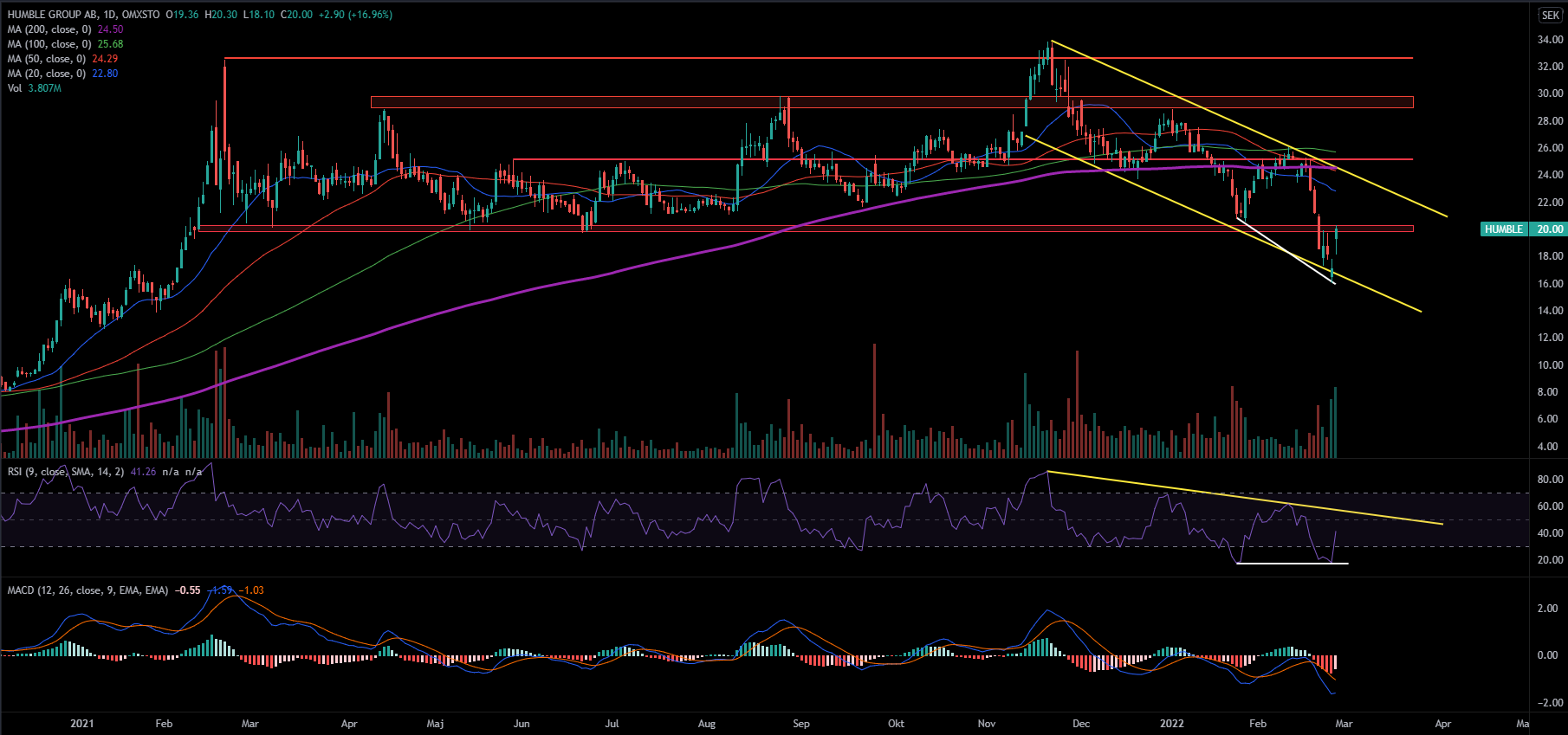 Humble har haft det tufft inledningsvis under det första kvartalet av 2022. Aktien är ner cirka 28,5 procent i år och ner mer än 40 procent från ATH-noteringen som sattes på 33,8 SEK tidigare i november. Nedgången har varit explosiv och en brant fallande trendkanal har formats på sistone. Humble rapporterade ett starkt fjärde kvartal i fredags och påvisade bland annat hög organisk tillväxt och slog analytikernas förväntningar. Aktien belönades med en uppgång på närmare 17 procent och aktiekursen tog sig upp mot ett viktigt motståndsområde.