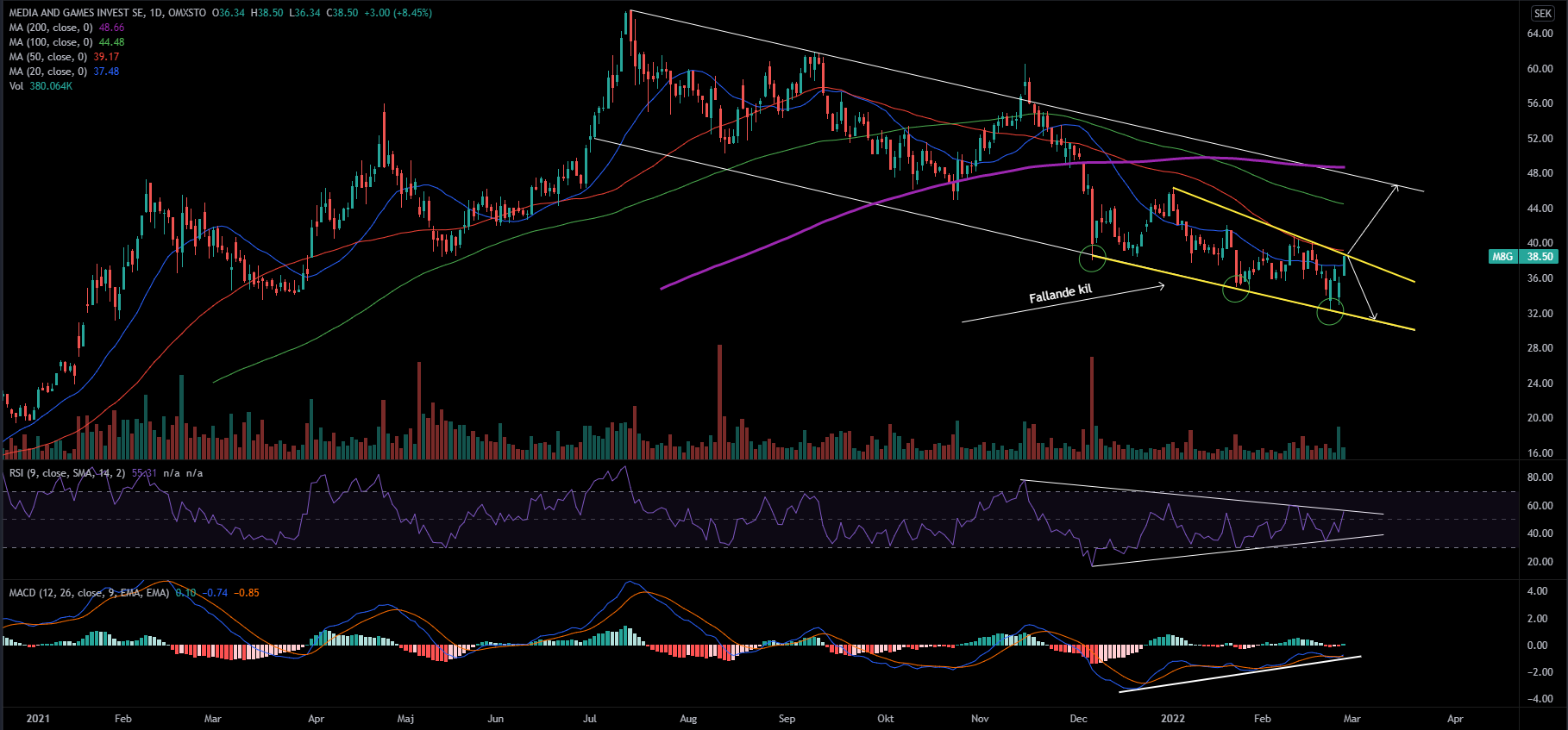 Gamingsektorn har överlag laggat efter i jämförelse med mycket annat på börsen under 2021. Media and Games tillsammans med Stillfront, Embracer, MAG Interactive, Zordix och andra sektorkollegor har som sagt gått svagt på senaste tiden efter att ha presterat väldigt bra under större delar av 2020. Samtliga aktier befinner sig i en nedåtgående trend och här tänkte jag att vi tittar närmare på Media and Games som pendlat hyfsat tydligt i en negativ trendkanal sedan ATH-noteringen. Det finns några intressanta signaler kring den tekniska biten som jag tycker är viktiga att belysa i dagsläget.