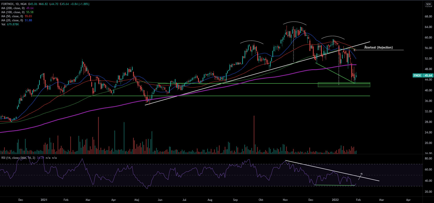 Om vi kikar närmare på RSI kan vi se att kraften i säljtrycket avtagit något, ett påstående vi kan argumentera för då vi kan se att en positiv divergens har formats. Jag skulle personligen avvakta med att ta position vare sig det handlar om en lång- eller kort position eftersom vi varken fått positiva eller negativa konfirmationer. Den senaste konfirmationen var när återtestet genomfördes på nacklinjen vilket resulterade i att aktien föll kraftigt under en kort period.