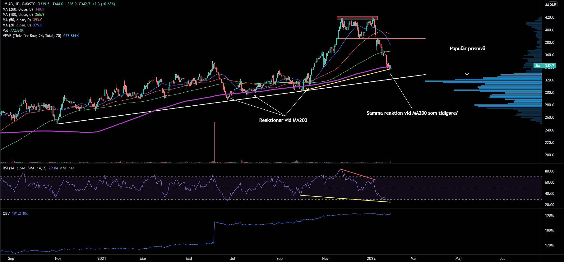 Jag tycker personligen att JM har letat sig ner mot betydligt attraktivare prisnivåer. I detta stycke kommer jag motivera detta med hjälp av primärtrenden, VPVR (Volume Price Visible Range) och den stigande trendlinjen som sträcker sig tillbaka lite mer än ett år. I grafen kan vi enkelt utläsa att MA200, även kallad primärtrenden har fungerat som ett pålitligt stöd vid några tidigare tillfällen. Om detta mönster skall repeteras bör JM vända kring dessa nivåer, ett brott under MA200 utan att nivån tas tillbaka snabbt skulle vara en svaghetssignal som logiskt borde resultera i tilltagande säljtryck. Indikatorn som presenteras grafiskt längst till höger i bilden ovan ger en överblick kring handelsvolymen vid de prisnivåer som inkluderas i bilden. Vi kan identifiera att aktien handlas strax över prisnivåer som varit populära historiskt, exempelvis kan vi se att flest aktier har bytt händer kring 318 SEK/aktie, det ger en indikation på att efterfrågan på aktier i JM bör vara hög vilket skulle kunna få priset att söka sig uppåt. Två andra tekniska detaljer som jag gillar är den dolda posivtiva divergensen som har skapats samt att OBV trendar starkt uppå och befinner sig vid ATH-nivåer.