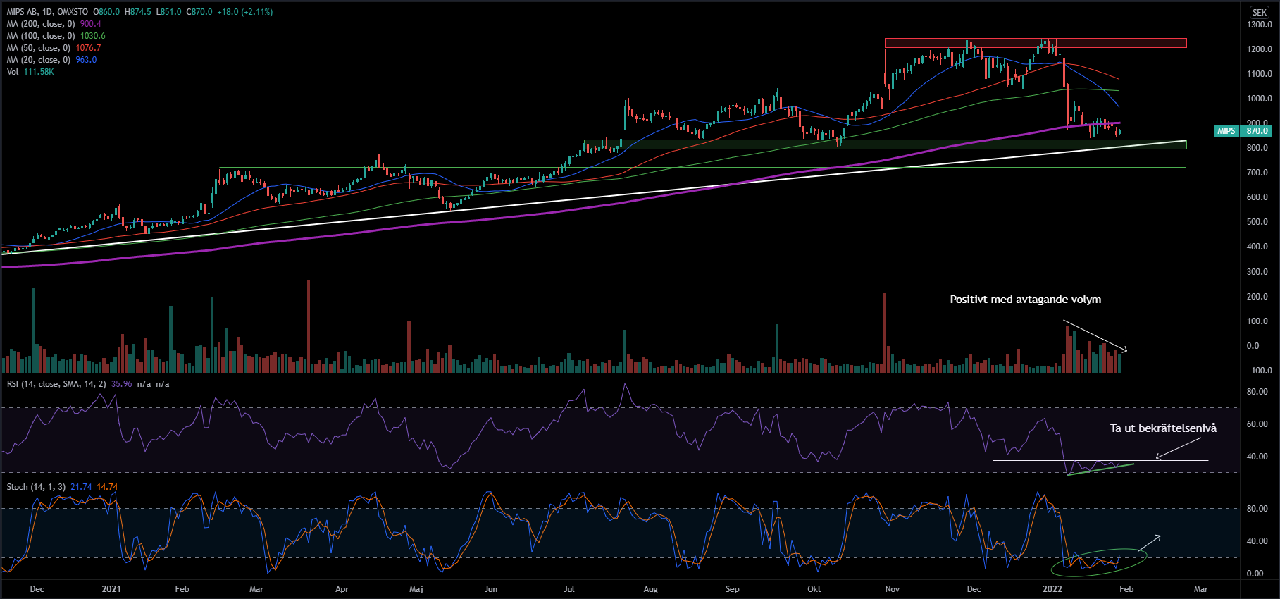 Mips har nyligen brutit sig under primärtrenden för första gången på väldigt länge. Senaste gången som aktien handlades under prinärtrenden var några få dagar mitt under Coronakraschen. Mips har gått väldigt starkt sedna dess och har egentligen noterat högre topppar och bottnar frekvent. I början av 2022 kostade en aktie cirka 1200 SEK, i fredags stängde Mips på 870 SEK. Aktien är ner en bra bit på kort tid, sådana nedgångar brukar inte allt för sällan skapa en rekyl i motsatt håll. Jag ser några intressanta tecken som talar för att köparna borde komma tillbaka på dessa nivåer, man ska dock ha i åtanke att detta kanske är starten på en längre nedåtgående trend,