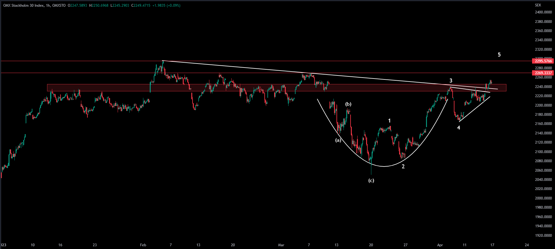 I fredags fick vi se den första stängningen ovanför det större motståndsområdet som sträcker sig från 2230 till 2245 vilket även innebar en stängning ovanför det fallande trendtaket som knyter samman de två tidigare topparna. Den price action vi sett på sistone är svår att inte vara positiv till. Jag tror trots det att vi är inne i fasen för ett toppbygge, dock med möjlighet att OMXS30 letar sig upp mot cirka 2269 och som högst mot februaritoppen (2295).