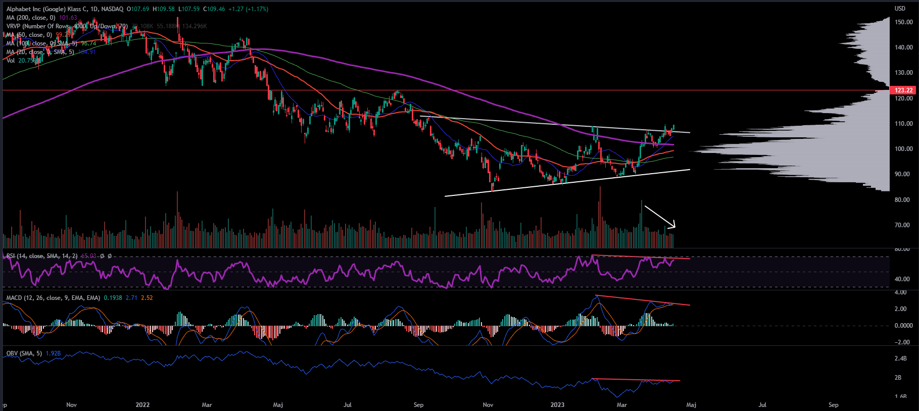 Alphabet har sedan en tid tillbaka börjat visa på ny stryka efter ett tungt 2022. Under februari misslyckades Alphabet att etablera sig ovanför primärtrenden och föll tillbaka för att skapa en högre botten jämfört med januaribotten. Där samlade aktien styrka och tog sig snabbt ovanför MA 200 igen, sedan återtestades MA 200 ovanifrån och denna gång agerade nivån stöd och gav bra reaktion (upp cirka 8 %).