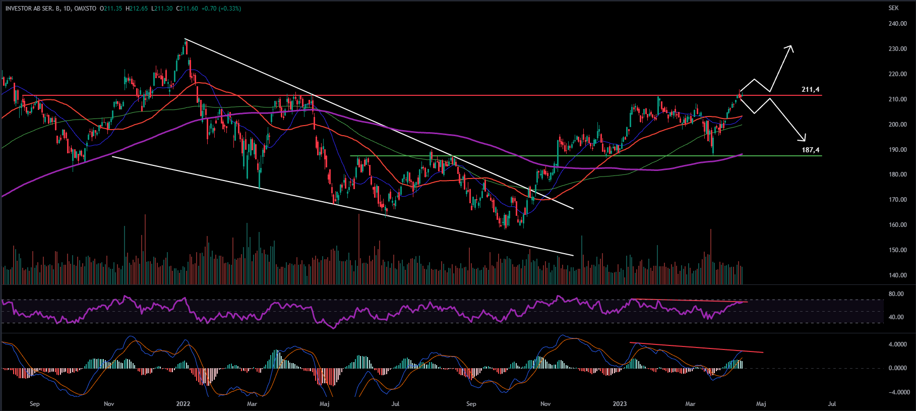 Givet utseendet i momentumindikatorerna så ser jag en större sannolikhet för att priset bör vända ner tillfälligt. Negativa divergenser kan utläsas i både RSI och MACD i flera tidsperspektiv (dags- och veckograf). MACD har dessutom börjat vända över för att eventuellt printa ett negativt medelvärdeskors. Om aktiekursen inte lyckas ta ut motståndet vid 211,4 så ser jag MA 50 som första viktiga stödnivå. Det finns en god chans för att Investor hittar stöd någonstans i mitten av rangen på grund av flera stödnivåer i form av glidande medelvärden befinner sig där (MA 20, 50 och 100).