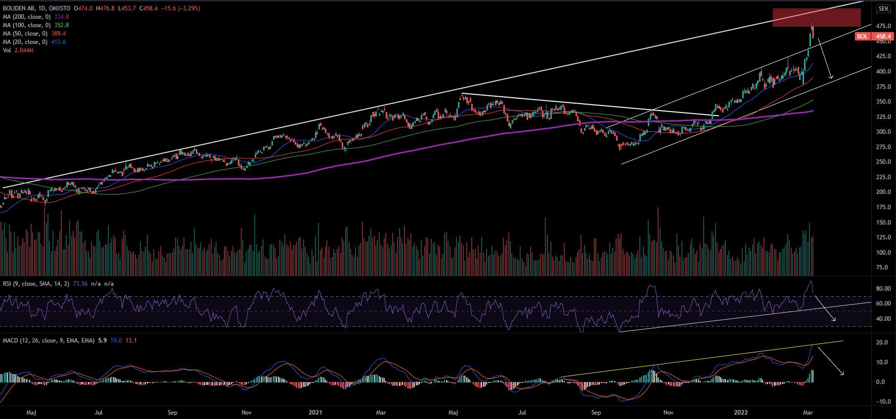 Om vi tittar på kursgrafen som sträcker sig tillbaka till första halvåret 2020 kan vi identifierar ett stigande trendtak som har respekterats duktigt tidigare. Boliden befinner sig nära trendtaket nu i och med den senaste impulsen upp. Det kan vara intressant att bevaka denna nivå då det skulle kunna leda till ett ökat säljtryck vilket vi fick se indikationer på i fredags då säljarna tog över vid de allt högre nivåerna. Ett tänkbart scenario är att Boliden ska leta sig in i den stigande trendkanalen som befinner sig en bit ner tillsammans med MA 20 och 50.