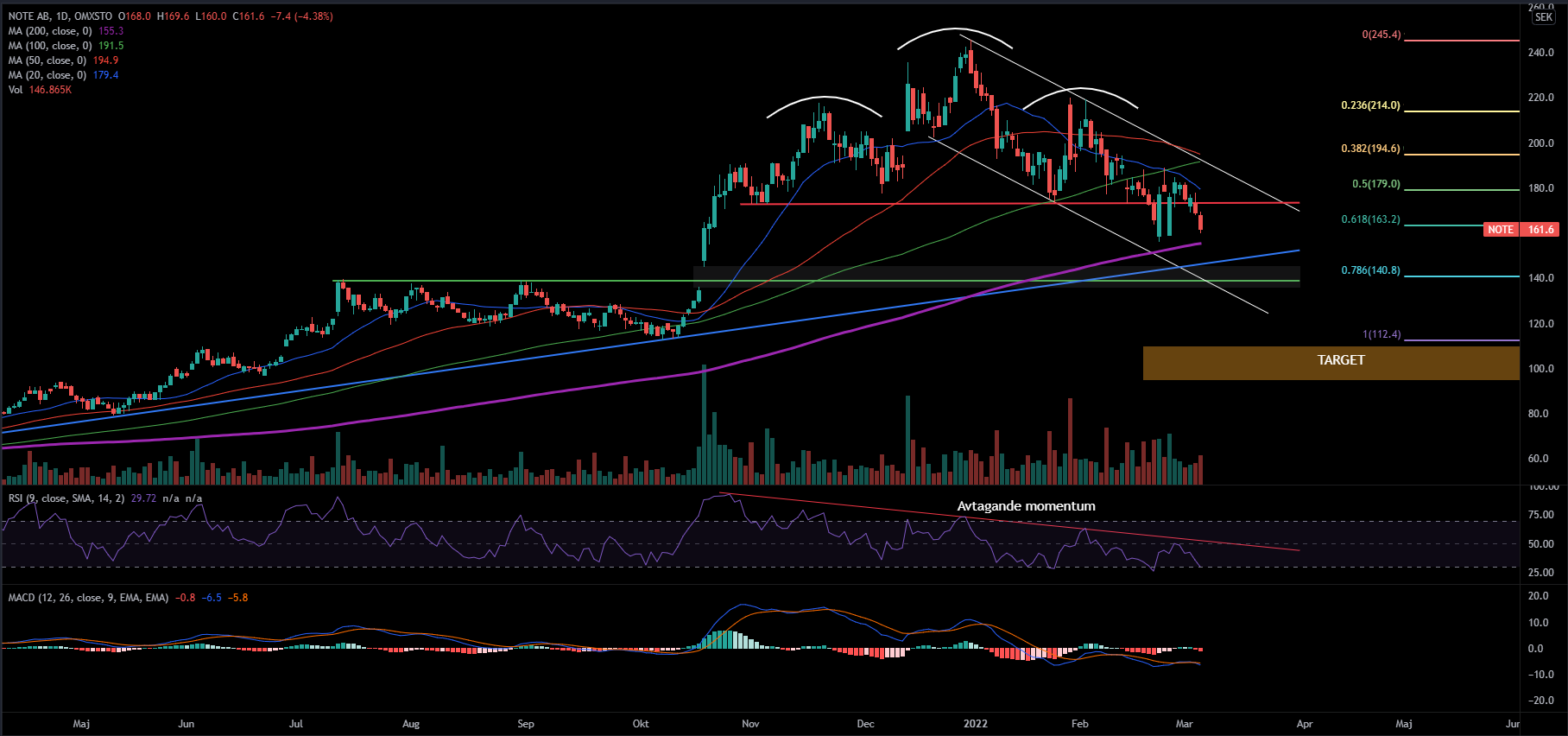 NOTE befinner sig i en kortsiktigt nedåtgående trendkanal och har gjort det sedan den högsta noteringen printades på 245,6 SEK. Jag tycker mig se en huvudskuldra-formation där nacklinjen har tagits ut, något som gör mig skeptisk till vidare uppgång. Risk-reward ser svag ut och i nedåtgående trender vill man försöka gå kort vid trendtaket och gå lång när aktiekursen befinner sig närmare trendgolvet. Enligt textboken skall aktiekursen gå ner lika långt som distansen mellan huvudets toppnotering och nacklinjen vilket resulterar i ett target kring 110 – 100 SEK.