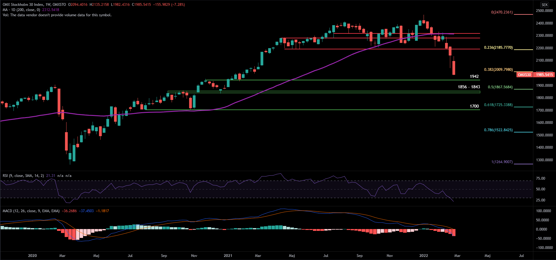 Jag blickar lite extra på fib 0,5 och 0,618 då jag har svårt att se att vi är klara på nedsidan så länge Ryssland-Ukraina krisen är oförändrad. RSI befinner sig i det översålda territoriet för första gången sedan Coronakraschen (weekly), samtidigt har MACD brakat under nollnivån. Detta kan översättas till att momentumet är extremt svagt och jag tycker därför inte det finns en stark grund till att ta en lång position. Jag kan tycka det är smartare att avvakta tills vi fått en bottenformation och sedan agera efter det. Tills dess tycker jag Risk-reward är oattraktiv och det är alltid svårt att investera emot den rådande trenden.