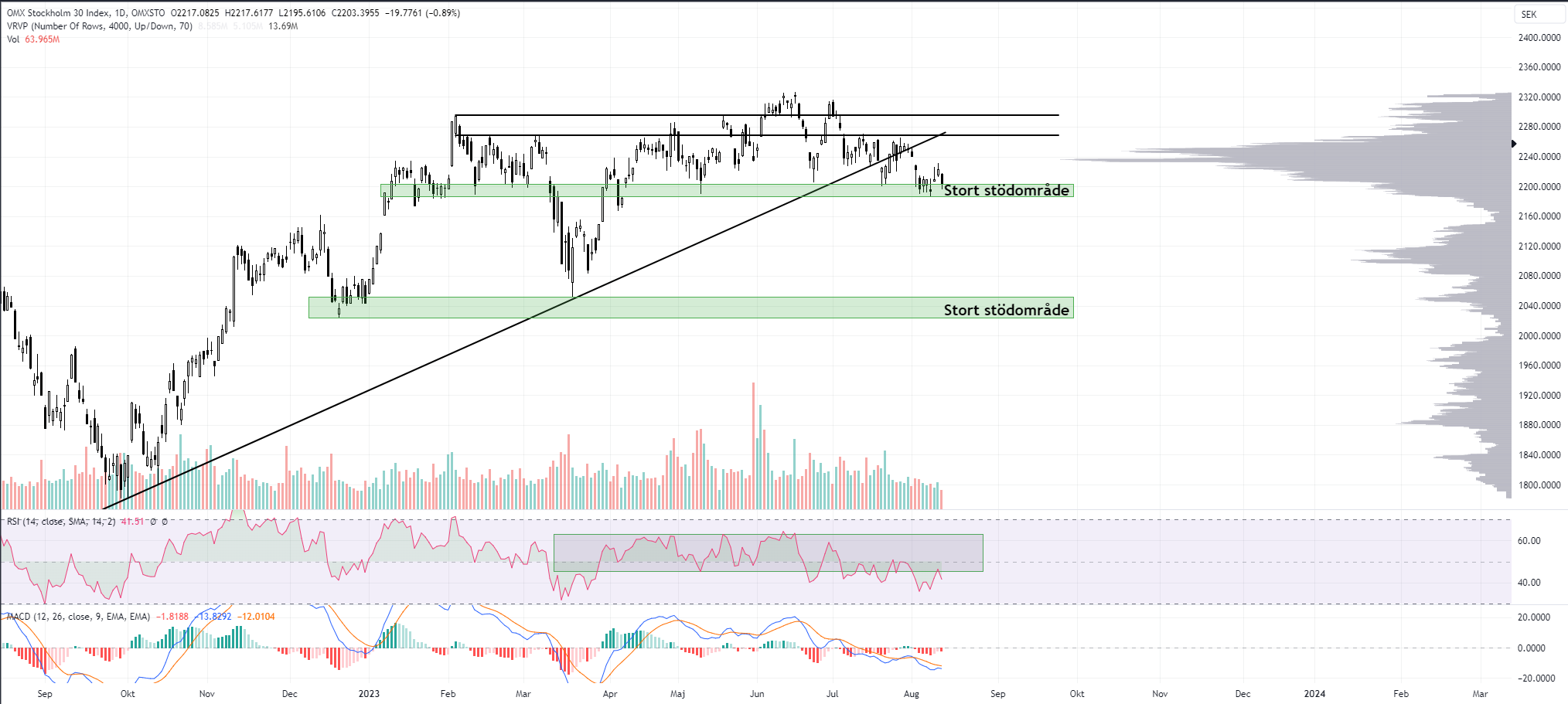 Om indexet istället skulle bryta under det stora stödområdet så kan man förvänta sig ett fall ner mot nästa stora stödområde som befinner sig en bra bit ner (2050 – 2023). Vid ett utbrott söderut så tror jag att momentumet kommer skifta helt och säljarna kommer bli starkare än vad de varit på länge. Med andra ord, likt ett “ras” som vi skådade under mars i år. Vi har ännu inte sett ett supertydligt trendskifte, dock kan man konstatera att den stigande trendlinjen som tidigare agerat stöd har tagits ut. Ur ett kortare tidsperspektiv har även lägre bottnar printats tillsammans med lägre toppar.