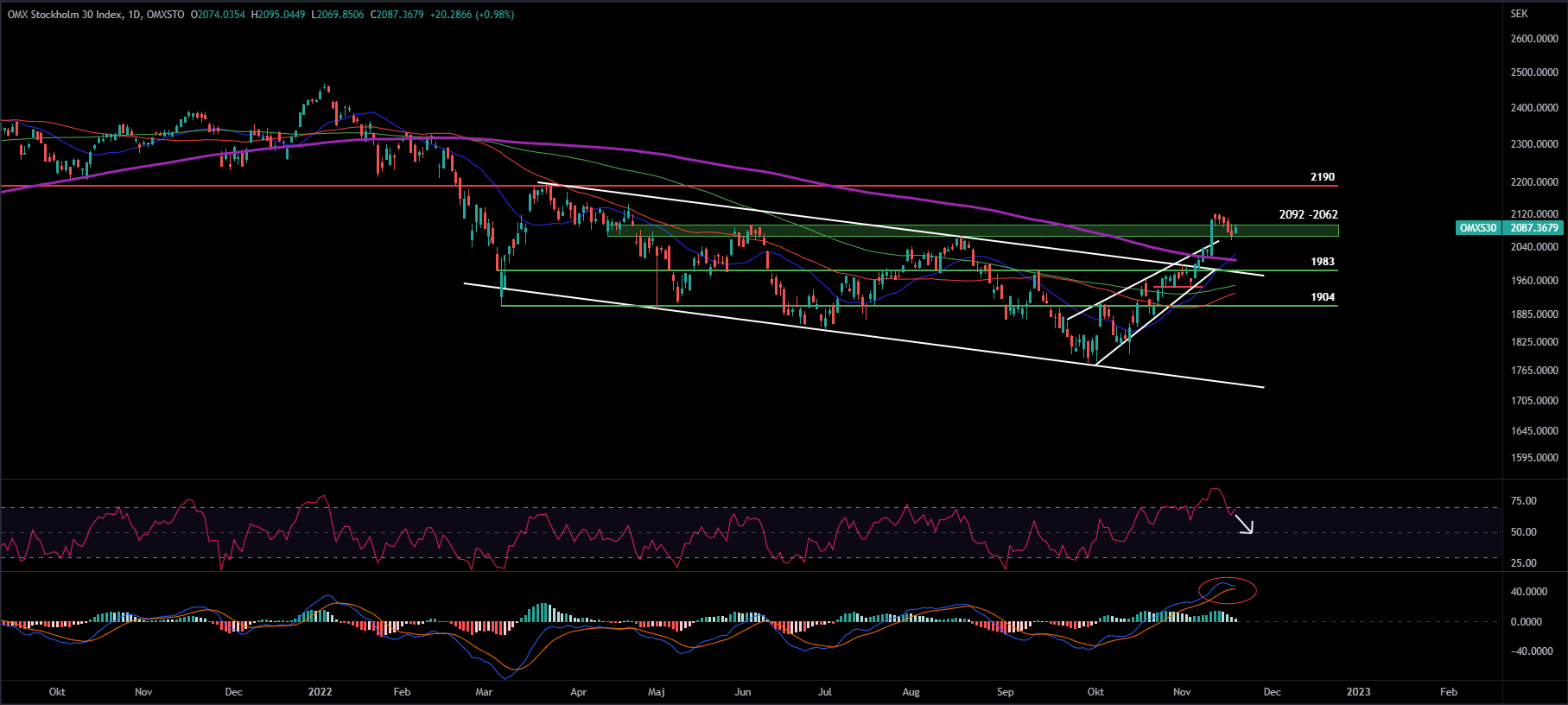 Min syn på OMXS30 är att en mindre rekyl står bakom hörnet. Den rörelsen i priset som vi sett under den senaste tiden bör resultera i en naturlig rekyl. Samtidigt kan vi se att både RSI och MACD har börjat vända ner från höga nivåer. RSI har rekylerat tillbaka ned under 70-nivån vilket talar för en försvagning i den kortsiktigt stigande trenden. MACD ser även ut att ha toppat ut och håller i min mening på att printa ett negativt medelvärdeskors. På nedsidan finns det flera stödnivåer som jag vill upplysa om. Först och främst har vi primärtrenden samt taket av den tidigare nedåtgående trenden. I övrigt finns det horisontella stödnivåer vid 2062, 1983 samt 1904. Hur djup den eventuella rekylen blir är det ingen som vet, men om köparna lyckas komma tillbaka vid något av de nämnda nivåerna kan man argumentera för att en ny högre botten är satt, något jag skulle se positivt på. På ovansidan har vi närmaste motståndet vid 2093 samt 2190.