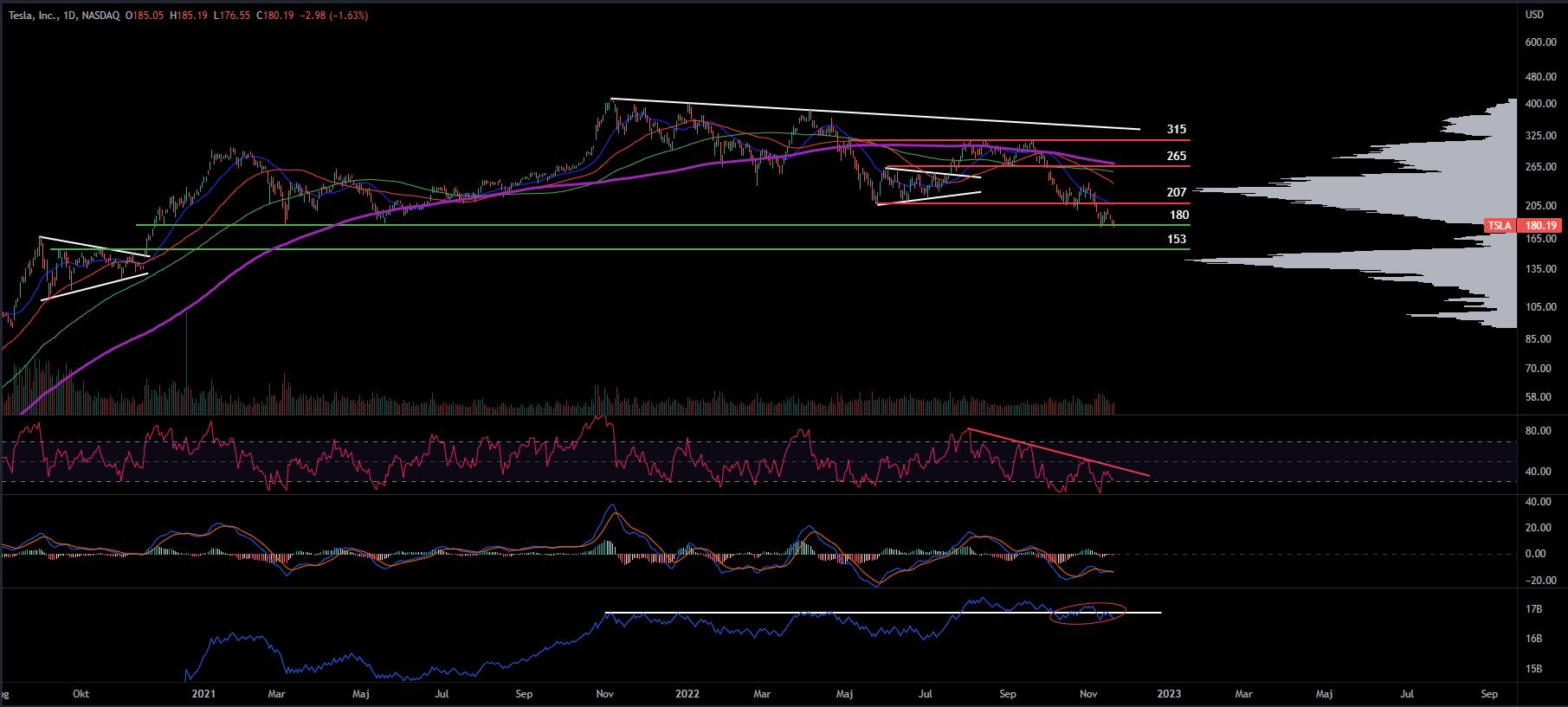 Teslas aktiekurs har rekylerat ned ordentligt i år tillsammans med många andra tekniktunga bolag noterade på Nasdaq. Aktiekursen har rasat närmare 50 procent och handlas under senaste perioden kring, enligt mig en väldigt viktig nivå. Tesla har under 2022 handlats inom en fallande trend som karaktäriseras av lägre toppar som följts upp av lägre bottnar. Senast under den föregående veckan noterade Tesla ett nytt årslägsta och ser nu ut att balansera kring 180 USD som är en kritisk nivå. Om köparna inte lyckas komma tillbaka kring dessa nivåer så finns det en betydande nedsida eftersom om 180 USD inte håller så fallerar den tekniska strukturen.