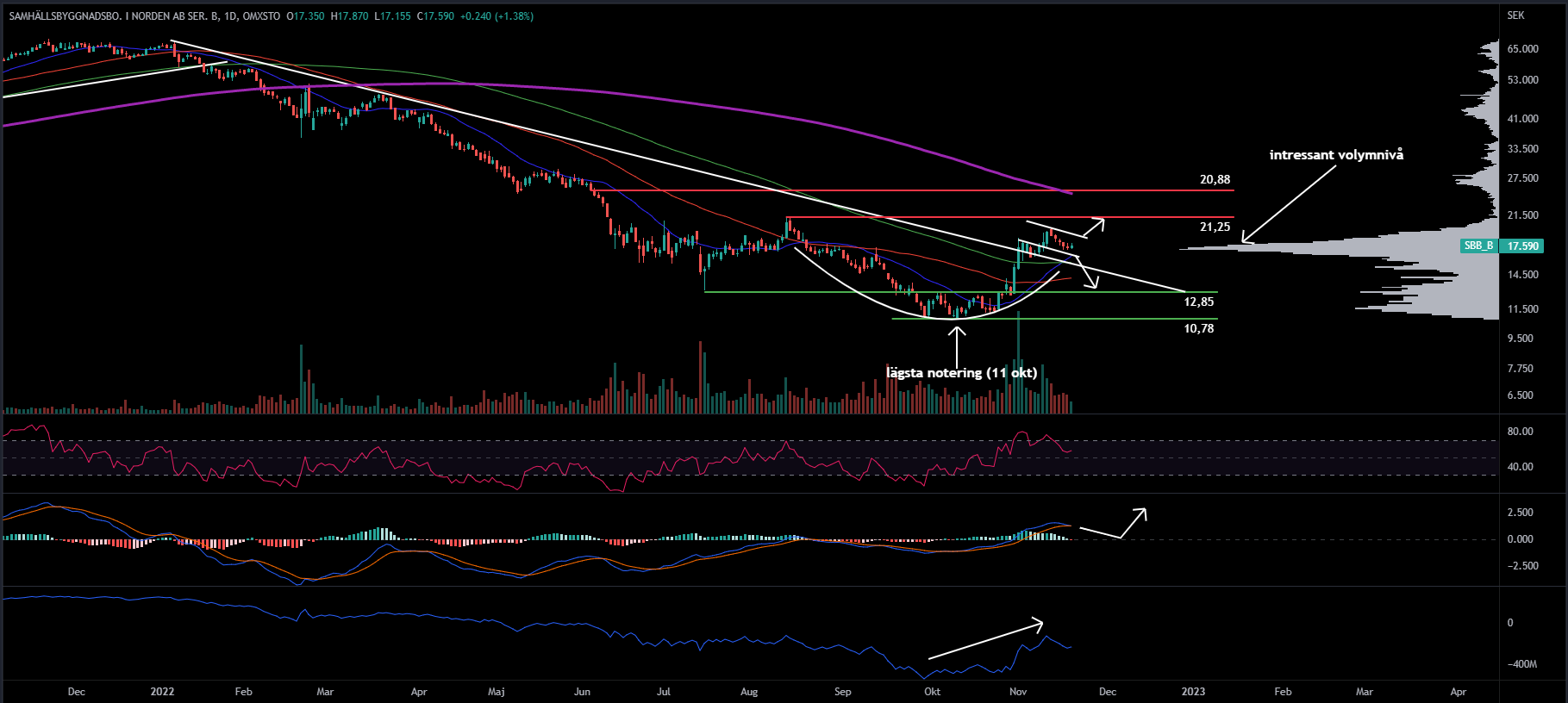SBB visar på en intressant prisformation, något som jag tänkte belysa i denna analys. SBB har stigit kraftigt sedan sin lägsta notering som sattes den 11 oktober. Sedan dess är aktiekursen upp cirka 63 procent, och noteras per fredagens stäningskurs ovanför MA 20, 50 och 100. Primärtrenden befinner sig fortsatt en bra bit ovanför aktiekursen och hittills har inte det negativa handelsmönstret brutits. Uppgången har berott mycket på att blankare täckt sina positioner i en större utsträckning än tidigare samtidigt som rapporten verkade lugna ner marknaden.