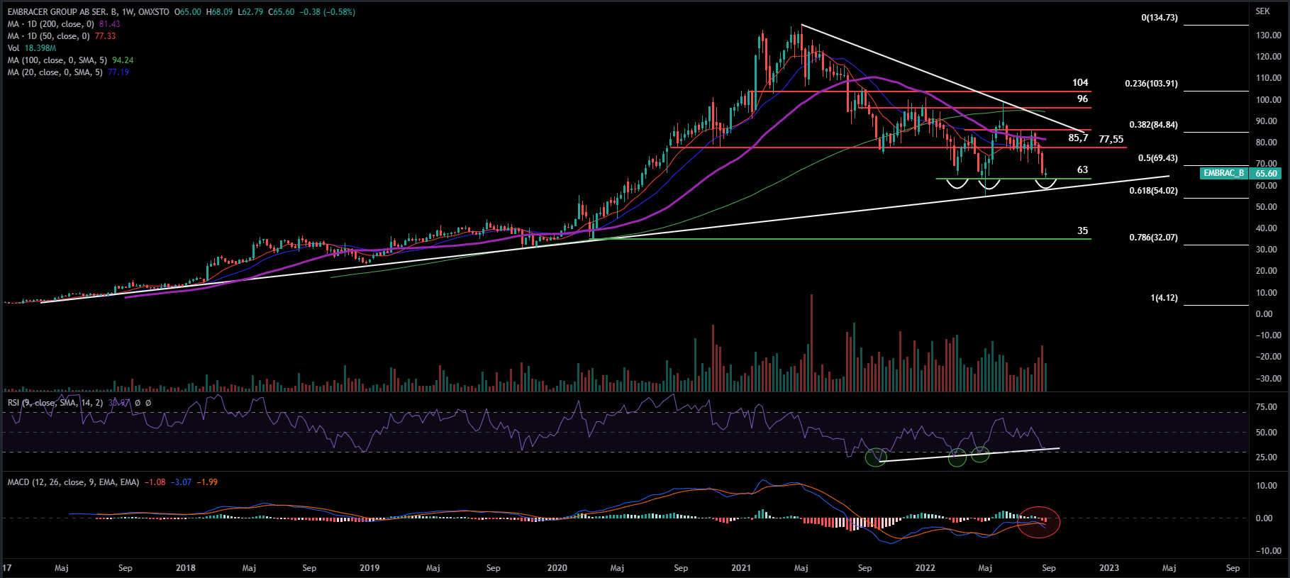 Embracer befinner sig för tillfället inom en fallande trend som kännetecknas av lägre bottnar och lägre toppar. Aktiekursen befinner sig även under samtliga glidande medelvärden vilket konfirmerar den nuvarande trenden. Om man zoomar ut så ser man dock att den långa positiva trenden fortsatt ligger intakt, men det ser onekligen ut som att den skall utmanas. I fredags stängde aktiekursen vid 65,60 SEK efter att nyligen testat av stödet som återfinns vid 63 SEK. Prisnivån är ett viktigt stöd och det skulle vara svagt bullish om aktiekursen lyckas pendla i sidledes här. Bästa scenariot hade varit om köparna kommer in med ny kraft så att aktiekursen studsar ifrån stödområdet med tilltagande volym. Om stödnivån däremot inte skulle hålla finns det en ökad risk för att den stigande trendens golv skall testas av, vilket även skulle vara runt omkring fib 0,618. Om den nivån inte håller ser jag nästa signifikanta stödområde kring 35 SEK vilket är bottennoteringen under coronakraschen.