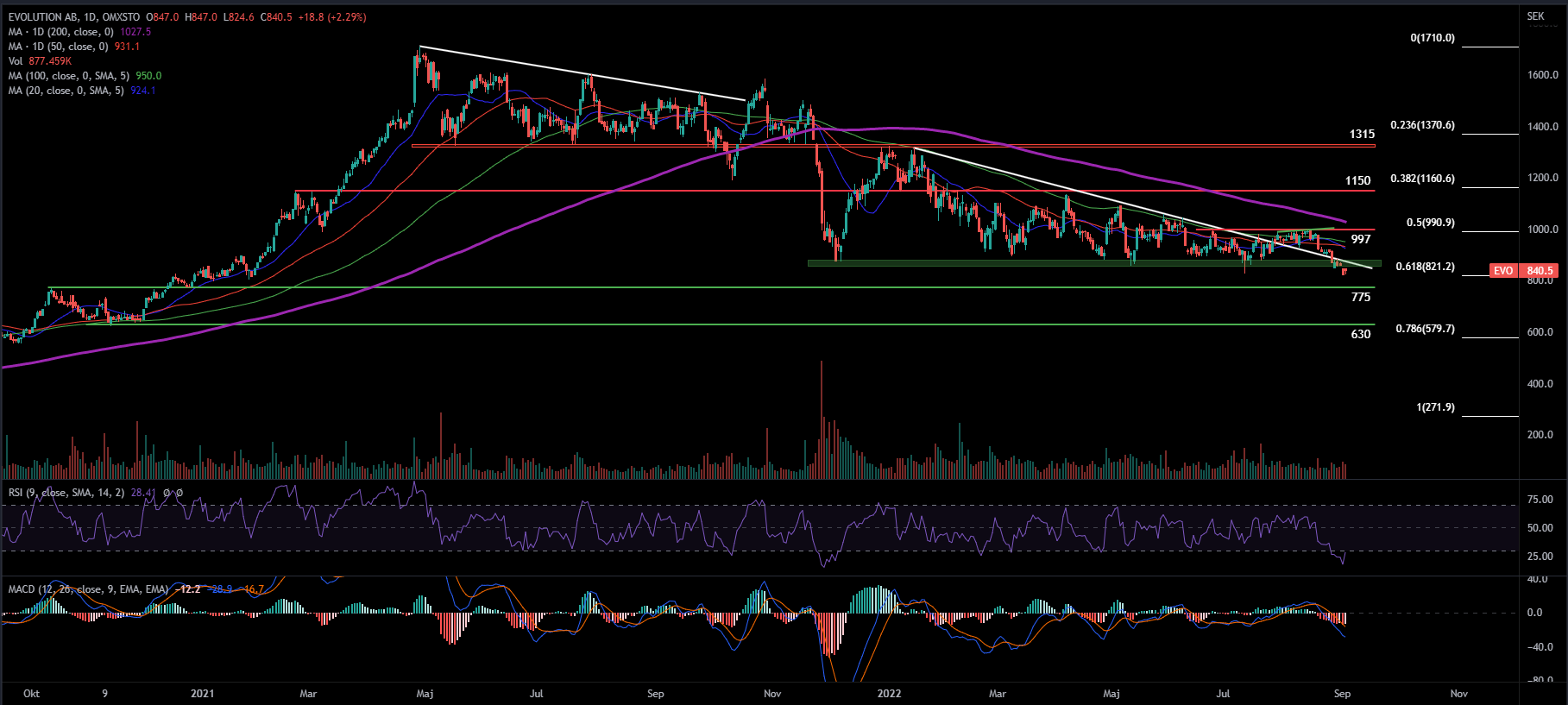 På nedsidan hittar vi det närmaste stödet vid 775 SEK och därefter 630. Till det förstnämnda stödområdet är det 7,5 procent till och det andra närmare 25 procent. Om Evolution skulle braka igenom fib 0,618 så är det inte orimligt att 775 SEK testas av snabbt. Det känns dock som att en rekyl upp skulle ske innan 630 testas av eftersom att det redan nu är relativt översålt. Exempelvis skulle ett återtest av tidigare stödet rimligtvis behöva genomföras innan det blir aktuellt för mer nedsida.