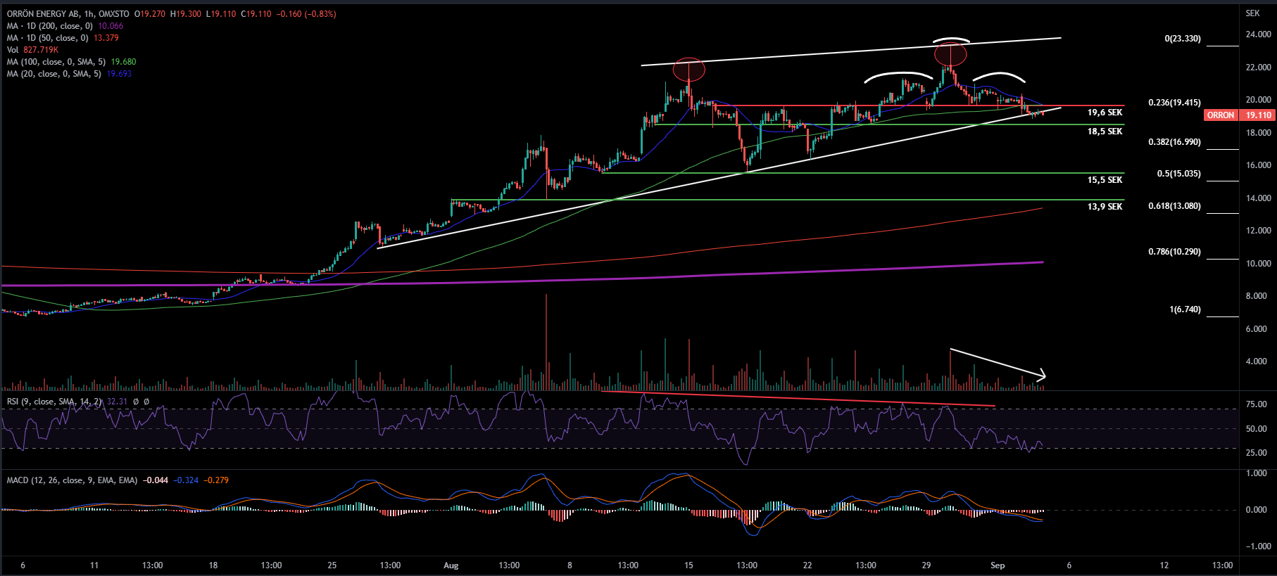 En sista sak som talar för en rekyl nedåt är en huvudskuldra-formation som formades inom den stigande kilen, två lägre toppar har formats kring all time high-noteringen och nu utmanas nacklinjen. Min tro är att 18,5 SEK skall testas av först och om den nivån inte håller skall stödet som återfinns vid 15,5 testas av. Momentumet i uppgången har svalnat av på sistone, MACD noteras under nollsträcket och RSI 9 befinner sig nära översålda nivåer.