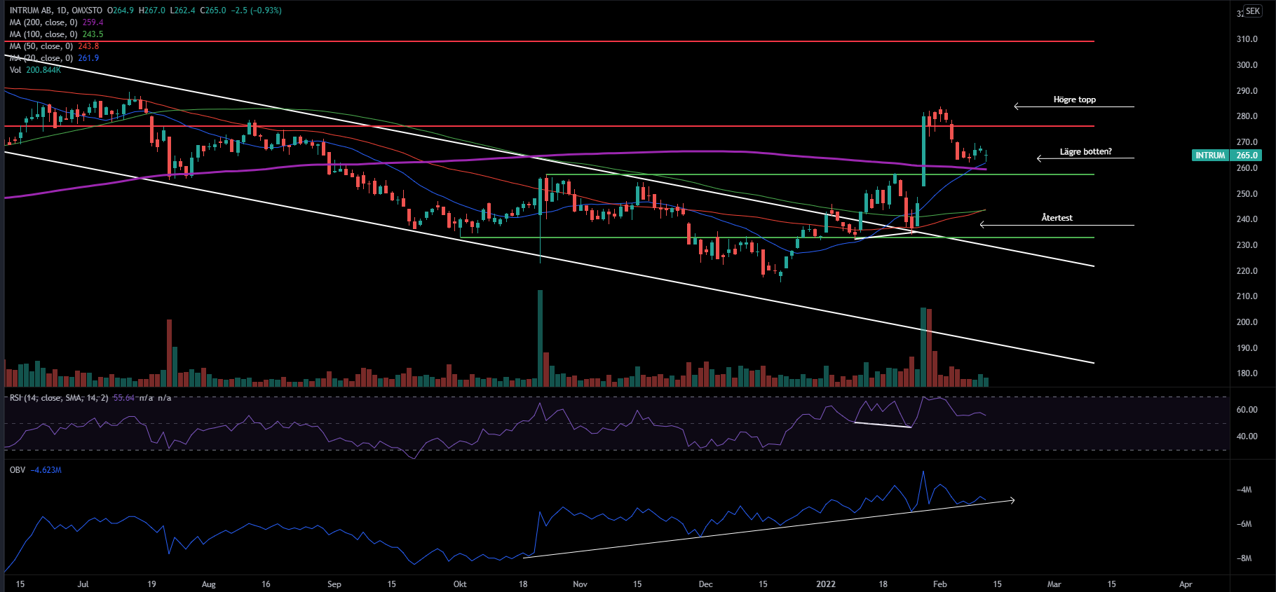 I och med utbrottet har Intrum lyckats notera sig över primärtrenden för första gången på över 100 dagar. Ett positivt tecken och nu återstår det att se om Intrum kan hålla sig tillräckligt stark för att studsa på MA 200 istället för att bryta under igen. Efter det initiala utbrottet steg aktiekursen upp mot motståndsnivån kring 257 – 258 SEK där en motreaktion skapades. Aktien letade sig sedan ner mot det föregående trendtaket och ett lyckat återtest genomfördes vilket genererade en bekräftelse och efter det steg aktien kraftigt, dels i samband med den starka rapporten. OBV har börjat trenda uppåt igen och började bilda en positiv trend innan utbrottet i aktiekursen. OBV är en bra indikator att bevaka då den till viss mån kan användas som en ledande indikator. På sistone har även momentumindikatorn RSI börjat forma ett positivare utseende, en gömd positiv divergens printades i daily och RSI befinner sig i det positiva territoriet sedan slutet av december. I fredags stängde RSI på 55 så det finns potential på uppsidan.