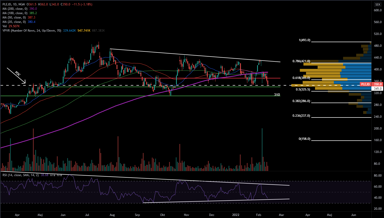 Jag skulle personligen bevaka den nuvarande zonen (345 -340) och därefter 310 SEK. Det är helt klart en negativ underton i och med att aktien handlas under primärtrenden samtidigt som det finns risk att Plejd bryter söderut ur den stora flaggformationen. Det skulle kunna vara något som leder till tilltagande kursfall under dessa skakiga tider på de finansiella marknaderna.