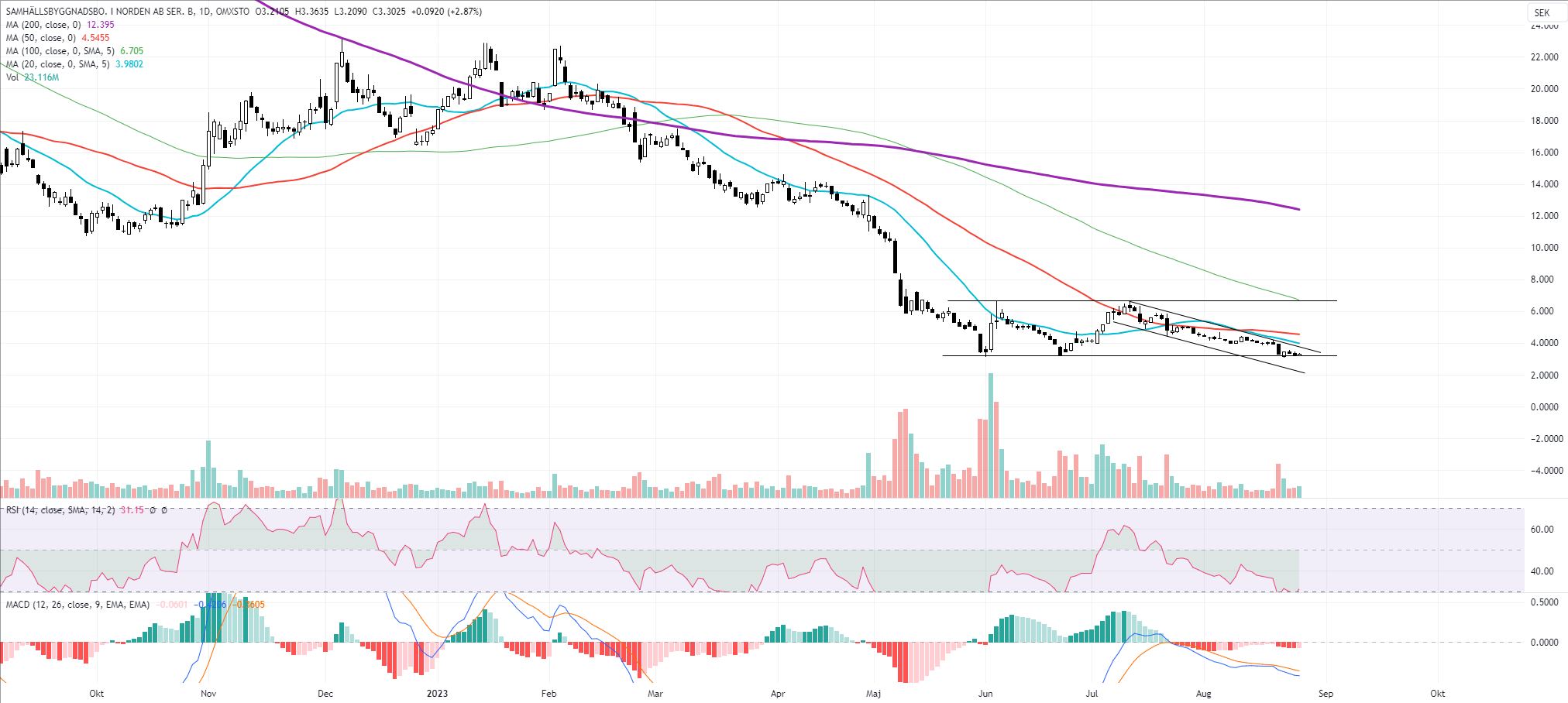 Med respekt för det historiska handelsmönstret finns det potential för en sådan rörelse igen. Dock behöver man invänta ytterligare bekräftelser. Det kan vara en bra idé att bevaka den mindre fallande trendkanalen som SBB har handlats inom under den senaste rörelsen på nedsidan. Om trendtaket tas ut i samband med det kortsiktiga glidande medelvärdet (MA20) så är det enligt mig ett första tecken på att en rekyl upp är inledd. Utöver det så är det också av vikt att titta på hur momenumtindikatorerna utvecklar sig.