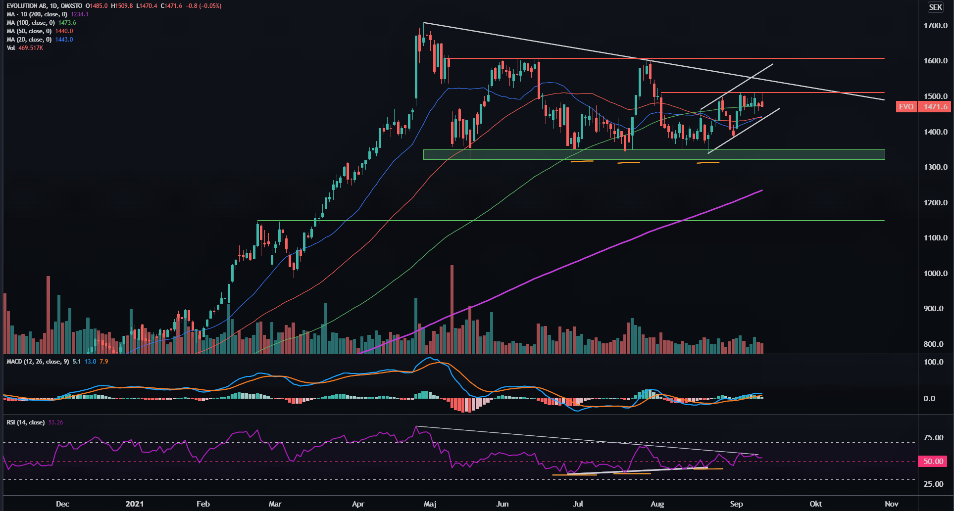 Time frame: DailyLikt Sinch har även Evolution knyckt en plats i OMXS30 under början av 2021 och har haft medvind på börsen vilket gjort att aktien trendat upp i en rask takt. Under första kvartalet 2021 handlades aktien upp rejält och köparna dominerade. På senare tid har bilden förändrats och aktiekursen har istället rört sig sidledes vilket jag tolkar som någon form av konsolidering. Grafen ser idag intressant ut då det har formats en bullflagga där flaggan är triangelformad. Ett utbrott norrut skulle kunna leda till att tidigare all time high nivåer utmanas. Samtidigt skulle ett utbrott söderut innebära att tidigare stödnivåer skall testas. Jag personligen tolkar konsolideringen som något positivt eftersom det är orimligt att en aktie endast trendar uppåt under en längre period. Konsolideringar är ofta hälsosam och möjligtvis kan det vara en fas där aktien samlar kraft för att notera nya högre nivåer i framtiden. Aktien har under de senaste tre veckorna bildat en mindre stigande trendkanal och börjar närma sig trendtaket i bullflaggan. I övrigt handlas aktien cirka 15 % över primärtrenden. Ett möjligt framtidsscenario är att kursen inväntar MA-200 för att testa det som stöd innan vidare uppgång.
