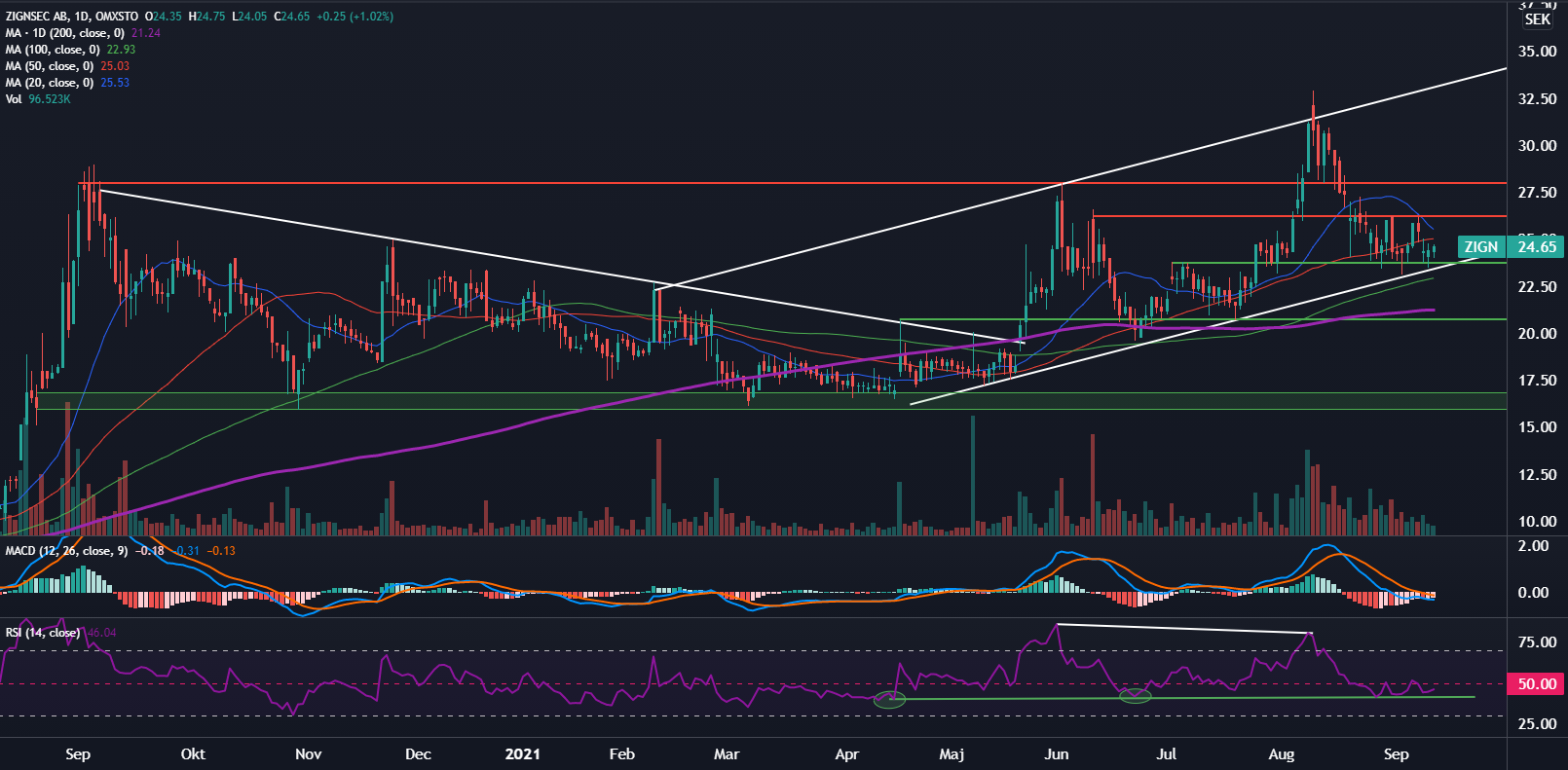 I fredags stängde Zignsec en liten bit över trendgolvet samt över en mindre stödnivå på 23,7 vilket är positivt. Frågan är nu om Zignsec kan fortsätta upp från dessa nivåer och utmana trendtaket för tredje gången, det skulle i så fall innebära en uppgång om 35-45 % beroende på hur snabb uppgången skulle bli. Om trendgolvet istället skulle brytas så skulle både MA100 och 200 med hög sannolikhet testas av. Om de två inte skulle hålla som stöd kan det signifikanta stödområdet omkring 16 – 16,9 behöva testas. Det scenariot kan vara något långsökt eftersom aktien i dagsläget handlas i en positiv trend med både MA100 och 200 som lutar uppåt.
