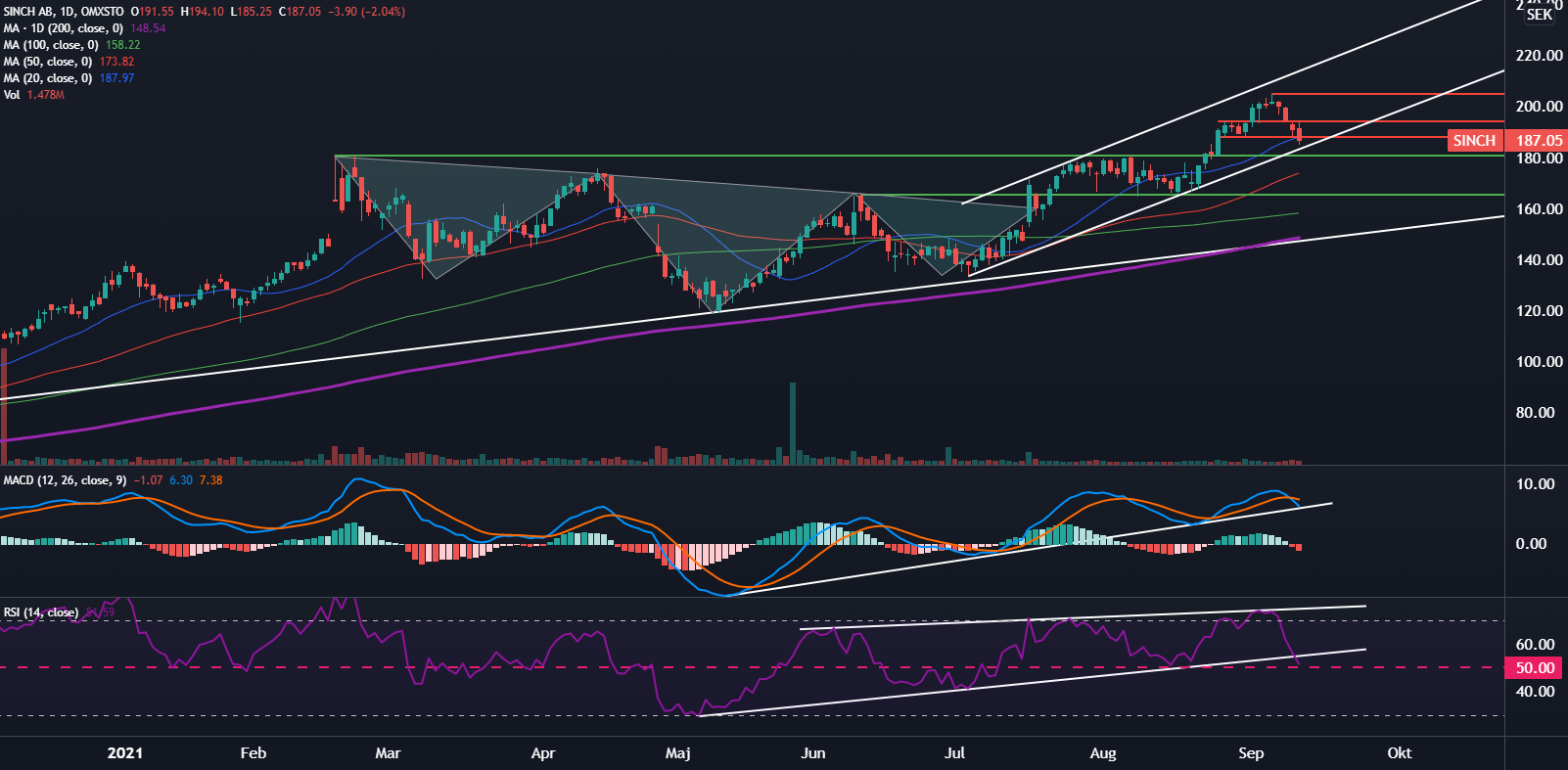 Time frame: DailySinch har varit en tydlig Coronavinnare och har befunnit sig i en positiv trend under en längre period. Nämnvärt är att Sinch under sommaren kvalificerade in i OMXS30. Aktien har ständigt noterat högre toppar följt av högre bottnar vilket är ett tydligt tecken på en positiv trend. Den positiva trenden bekräftas av att aktien handlas över primärtrenden (MA200) som även har en positiv lutning. Under sommaren formades en omvänd huvudskuldra, vilket i den tekniska världen är en positiv formation som indikerar på vidare uppgång. Notera att huvudet och den högra skuldran studsade perfekt på trendgolvet som sträcker sig från Coronakraschen 2020. Den 16e juli bröt aktien över den lutande nacklinjen med tilltagande volym för att utmana tidigare all time high nivåer på 180,6. Efter cirka en månads konsolidering bröt aktien 180,6 nivån för att notera ett nytt all time high på 204,8.