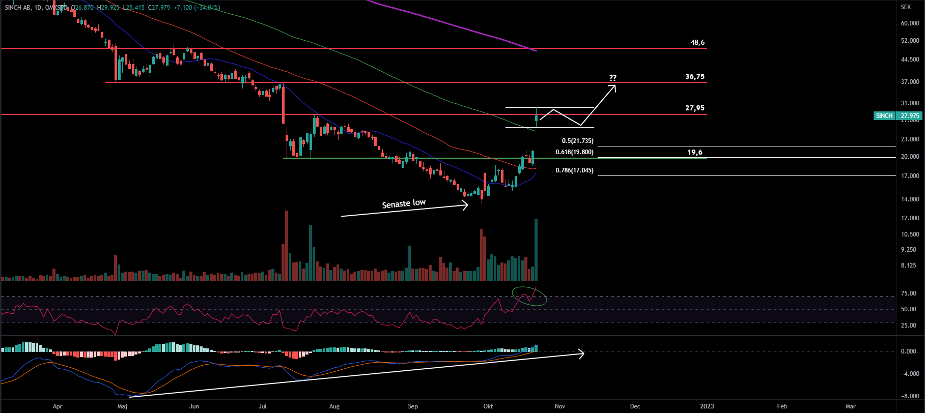 Den intressanta frågan just nu är om det vi såg förra veckan var det som satte botten för denna gången i Sinch. Finns det mer uppsida, eller ska aktiekursen rekylera ner innan vidare uppgång? Rent tekniskt så har inget trendskifte genererats än så länge och heller ingen tydlig köpsignal. Dock finns det fler förutsättningar för att en sådan signal genereras i dagsläget jämfört med innan. För första gången på länge handlas aktiekursen ovanför MA 20, 50 och 100 vilket indikerar ett ökat momentum i köpkraften, framförallt på kortare sikt. Samtidigt kan vi se att RSI handlas ovanför 70-nivån, en nivå RSI inte sett på mer än ett år (daily). Utöver detta så har MACD tagit sig ovanför nollnivån, en nivå som MACD befunnit sig under i över ett års tid. Med detta sagt har den senaste veckan ändrat karaktären för den tekniska bilden från något väldigt negativt till något betydligt mindre negativt.