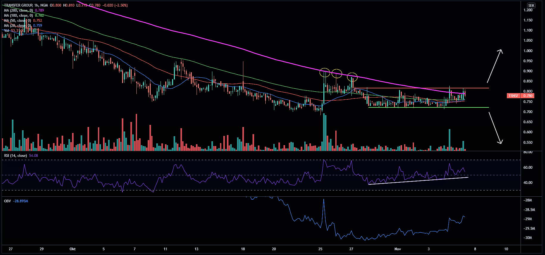 Just nu rör sig Transfer i en mindre range där en tydlig stödnivån kan märkas ut runt 0,72 samtidigt som ett motstånd har etablerats runt 0,816. Om MA 200 kan tas ut följt av att 0,816 bryts kan uppgången tillta kraftigt inom ett kortare perspektiv. Aktien har hittills inte visat tillräcklig styrka vilket gjort att den handlas sidledes vilket kan fortsätta tills ett utbrott sker på antingen ned eller uppsidan.