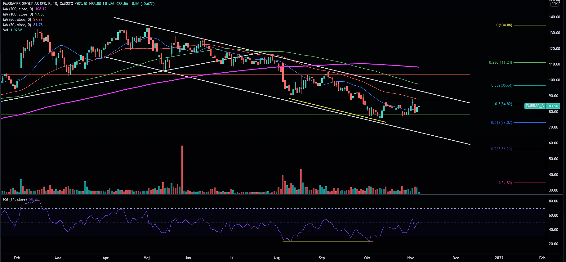 Embracer har nyligen tagit sig över MA 20 efter att satt en botten kring 74,5 vilket nästan motsvarar fib 0,618 (botten från Corona). Embracer studsade fint på den nivån efter att en större positiv divergens uppstod i både RSI och MACD. Nästa nivå som kan vara värd att bevaka är MA 100. Just nu ligger kursen strax under MA 100 efter att relativt nyligen utmanat nivån vilket slutade i att säljarna tryckte ner kursen till stödområdet kring 78.