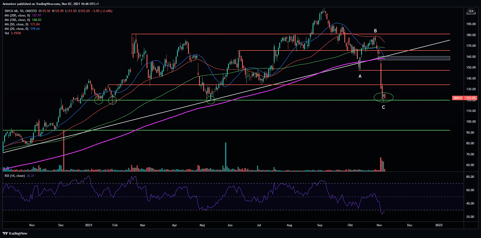 För att gå över till den tekniska biten så har den såklart förändrats en del och det mest anmärkningsvärda är att den långsiktiga positiva trenden har tagits ut med stora säljvolymer.  MA 200 börjar har även börjat luta neråt och MA 20 ser ut att korsa primärtrenden ovanifrån vilket kan ses som en negativ teknisk signal. En korrektionsfas har möjligtvis skapats i form av en ABC-frekvens men det är för tidigt att bedöma om Sinch är klar på nedsidan. Kursen visade ingen respekt för stödnivåerna på 147 och 134,5, dock har stödnivån på 120 testats av och hållit än så länge. När 120-nivån testades av formades en “Bullish Hammer” vilket är en relativt stark candlestick som talar för tilltagande köpkraft, i det här fallet kring 120. Om vi blickar tillbaka i grafen ser vi att den här nivån har agerat stödnivå och vi tidigare reaktioner har nivån fungerat som en trampolin eftersom kursen avancerat i efterhand. Om 120 inte håller ser jag nästa signifikanta stödnivå runt 92.