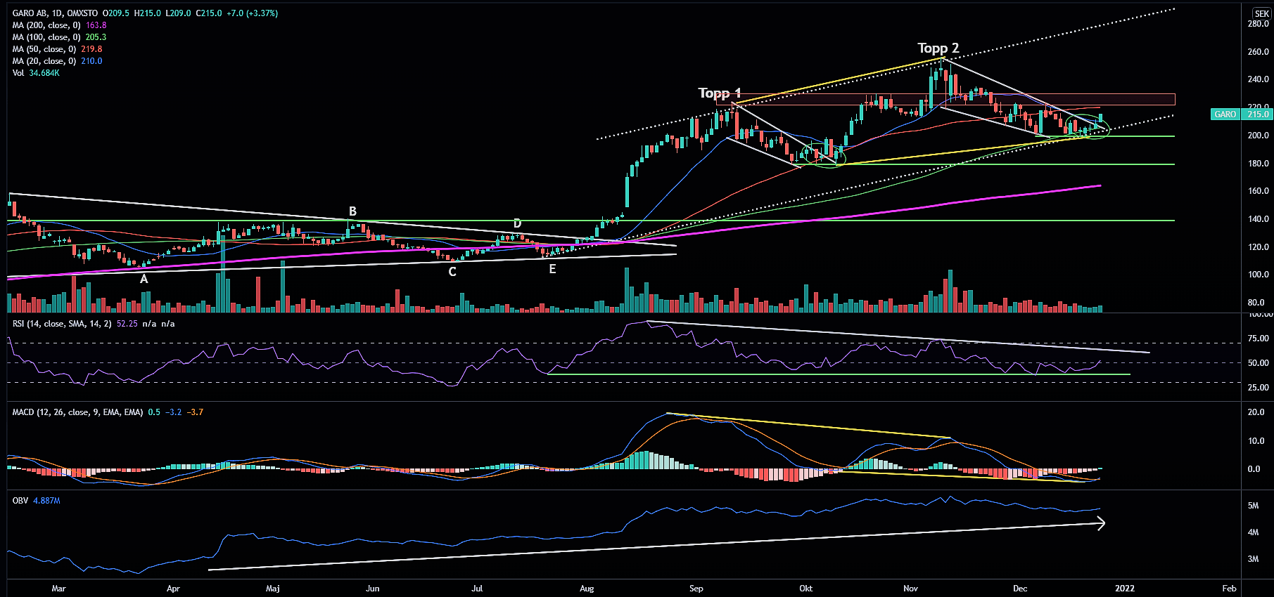Garo kan man säga är vinnaren av 2021 iallafall mätt till de aktierna som presenteras i det här avsnittet. Garo är upp närmare 70 % för året efter att ha befunnit sig i en konsolidering inledningsvis för att sedan bryta upp för att notera betydligt högre toppar. Som vi kan se i grafen så befann sig Garo i en triangelformad konsolidering fram till och med augusti. I samband med en stark rapport för andra kvartalet så stack aktiekursen iväg norrut och nu kan vi konstatera att köparna blir köpglada på allt högre nivåer.