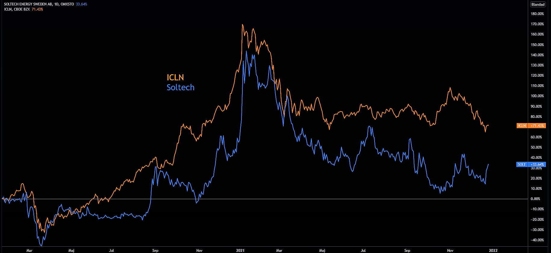 Soltech är noterade på First North Nasdaq och är en helhetsleverantör av solcellslösningar. Under 2021 har aktien gått svagt efter att ha lämnat ett väldigt starkt 2020 bakom sig. Om vi tittar på iShares Global Clean Tech ETF:en som trackar globala bolag inom cleantech/grön energi så kan vi även där se en svag prestation under 2021. Det betyder med andra ord att sektorn i stort har fallit vilket är en förklaringsfaktor till Soltechs svaga prestation på börsen.