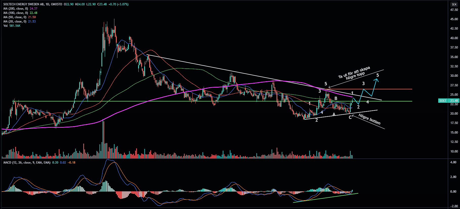 Tekniskt sett har lägre bottnar ständigt noterats följt av lägre bottnar, ett handelsmönster som jag tror många investerare undviker då man allt som oftast vill investera i en positiv trend. På senaste tiden tycker jag å andra sidan att Soltech börjat visa styrka relativt mätt mot senaste året. Det jag ser extra positivt på är att aktien nyligen formerat en högre botten samtidigt  som torsdagens stängningskurs var över MA 20, 50 och 100 (daily). Min tolkning är att sentimentet har blivit positivare på sistone och möjligtvis kan den fallande trendlinjen tas ut i samband med primärtrenden för att sedan forma en högre topp. Det skulle i sin tur tolkas som ett trendskifte i tidigt skede och chansen att många momentuminvesterare då vill ta position ökar vilket kan driva upp priset.