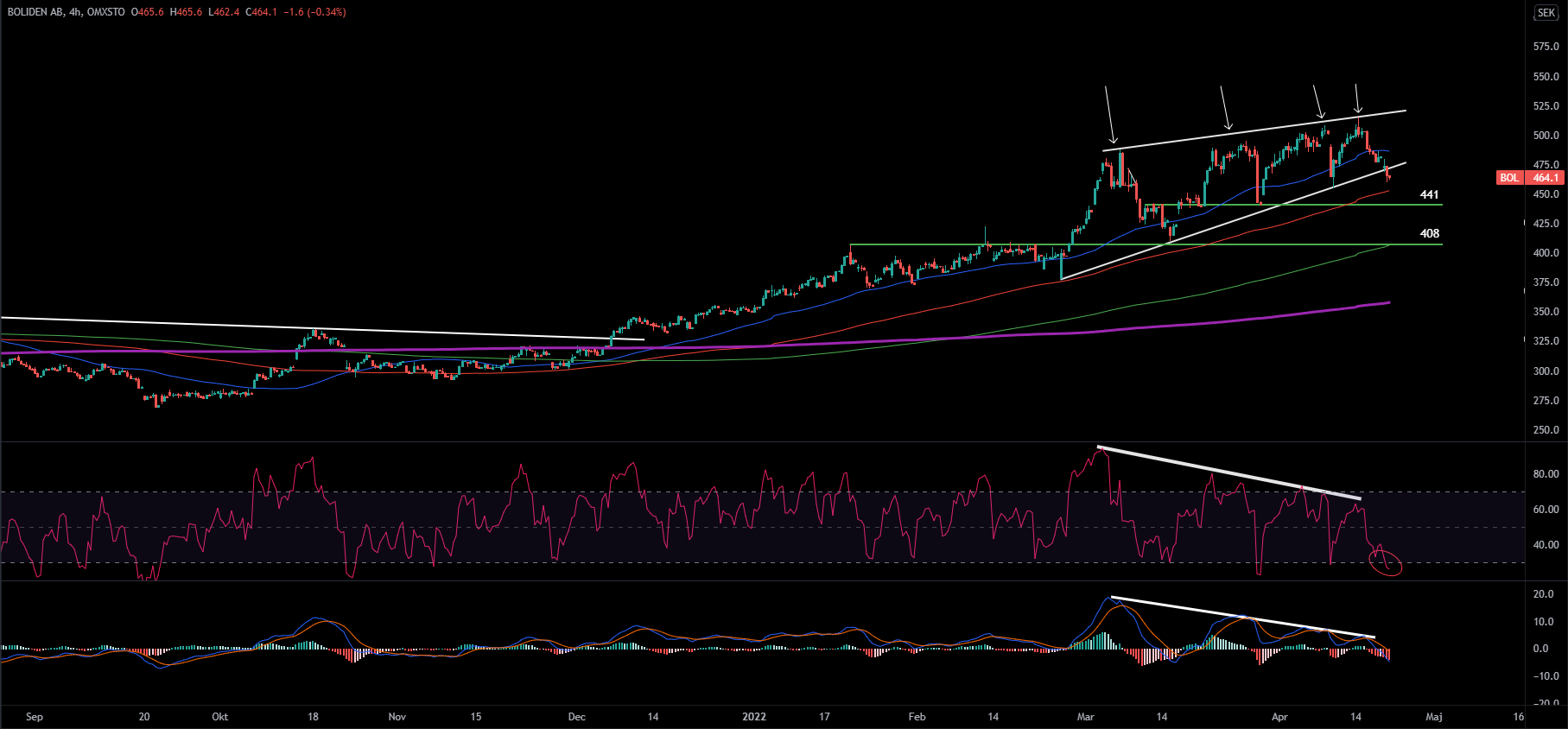Jag tittade på Boliden för cirka en och en halv månad sedan och då hade aktien hunnit resa lite som följd av den osäkerhet som fortsatt råder på de finansiella marknaderna. Senast såg jag begränsad uppsida i Boliden, aktien har dock hållit emot bra och har rekylerat i tid i stället för i pris. Dock har en stigande kil formats och i fyratimmarsgrafen syns den väldigt tydligt. En prisformation med negativ underton och i fredags kan vi se hur kilens trendgolv brast. Rimligtvis kan vi förvänta oss ett återtest av nivån och därefter finns det enligt mig risk för ett fortsatt nedställ. Snabba uppgångar brukar sluta i rekyler, för att skapa sig en förståelse för hur rekylen kan komma att spela ut sig kan det vara bra att identifiera stödnivåer på nedsidan. Närmaste stödnivån på nedsidan är MA 50 som vid tidigare tillfällen har agerat som ett pålitligt stöd. Strax under MA 50 finns det horisontellt stöd vid 442 SEK, därefter hittar vi MA 100 på samma nivå som ett annat horisontellt stöd vid 408 SEK. Primärtrenden ligger en bra bit under fredagens stängningskurs och enligt mitt synsätt är det väldigt stretchat. Min poäng är inte att Boliden skall ner hela vägen dit men givet prisformationen som har formats på sistone så tror jag på ett scenario där Boliden inte visar på relativ styrka.