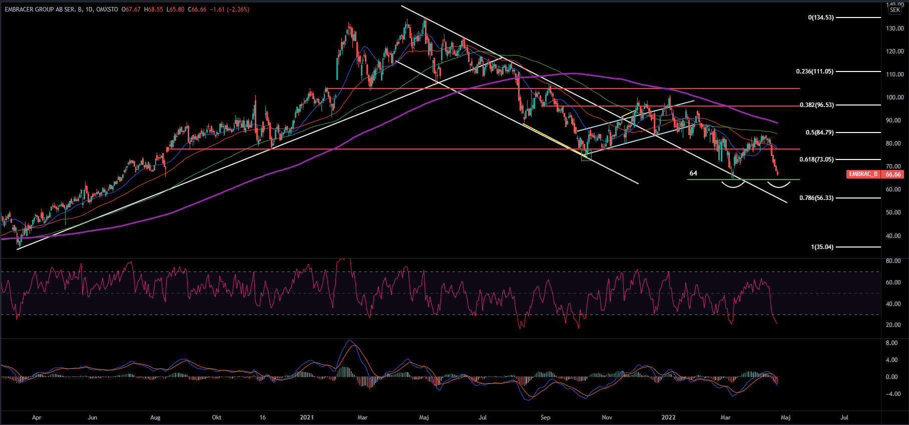 Tekniskt sett kan vi se att Embracer först pendlade inom en fallande trend som tog form efter All time high-noteringen 2021. Sedan samlade aktiekursen kraft och ett utbrott över det fallande trendtaket blev ett faktum. Efter utbrottet formades en mindre stigande trendkanal och under denna period ökade optimismen. Motståndet vid den psykologiska nivån, 100 SEK testades av vid två tillfällen men säljarna visade sig vara starkare och en signifikant högre topp lyckades ta form. Efter detta moment kom en ny lägre lägsta att formas vid cirka 65 SEK.