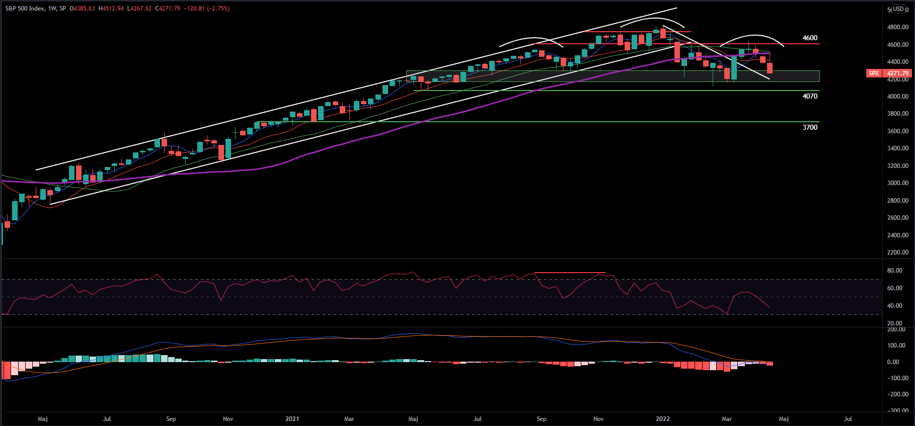 S&P 500, ett världsledande index har befunnit sig i en tydligt uppåtgående trend sedan coronakraschen. Dock har den positiva bilden förändrats drastiskt under Q1 2022, i grafen kan vi se hur SPX bröt söderut ur den positiva trendkanalen inledningsvis under året. Sedan genomfördes ett återtest som gav en motreaktion och indexet fortsatte sedan nedåt tills stöd hittades vid intervallet 4170 – 4300. Ljusstakarnas utseende avslöjar att denna zon utgörs av en hög efterfrågan, långa svansar på nedsidan samt en Bullish Engulfing som ledde till en impulsrörelse på uppsidan. Impulsen dog snabbt ut efter att stött på den horisontella motståndsnivån kring 4600, en kraftig motreaktion skedde och sedan dess har S&P trendat ned under tre veckors tid.