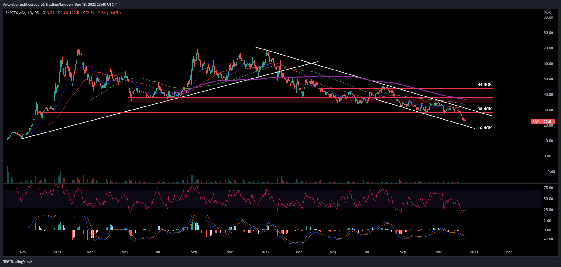 Momentumindikatorerna ser fortsatt dystra ut, RSI befinner sig under 30-nivån och MACD har inte lyckats notera sig ovanför nollnivån och trendar istället ned mot de tidigare bottnarna som syns i MACD. Från fredagens stängningskurs (22 NOK) är det drygt 30 procent ned till 16 NOK, med det sagt finns det en betydlig nedsida kvar. Dock betyder det nödvändigtvis inte att kursen måste ned dit, det finns ju såklart många fundamentala pusselbitar som kan falla på plats vilket skulle kunna ge Zaptec kraft. Å andra sidan kan jag inte se några tekniska faktorer som indikerar att en vändning står runt hörnet. Det man vill se är ett utbrott norrut från den fallande trendkanalen. Innan dess är det trendkanalen som talar sitt tydliga språk.