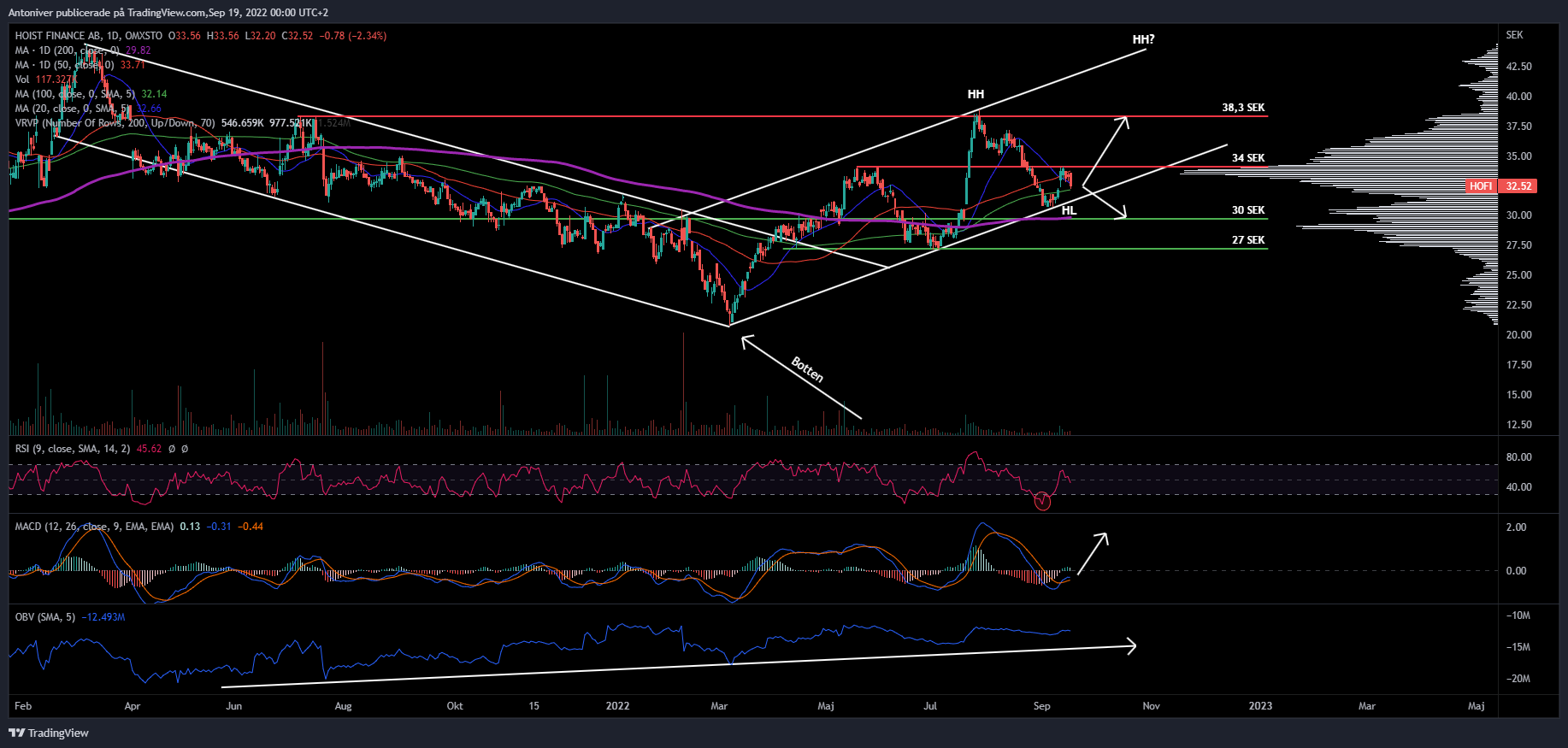 Hoist Finance tycker jag ser intressant ut ur tekniskt perspektiv, mycket på grund av att aktiekursen allt tydligare befinner sig inom en hälsosamt stigande trendkanal. Enligt mitt sätt att se det så har Hoist Finance printat en signifikant botten vid 20 – 21 SEK och har sedan dess bildat en stigande trendkanal där högre toppar har satts följt av högre bottnar. Sedan innan befann sig aktiekursen i en fallande trend och noterades även då under samtliga glidande värden från och till. Hoist Finance lyckades dock bryta sig ur den negativa trenden under april tidigare i år, detta visade sig vara början på en mer positiv resa för aktiekursen.