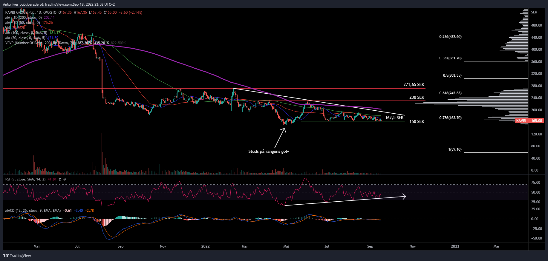 Kambi har i huvudsak pendlat i sidledes under lite mer än ett års tid. Rangen som jag ser är bred och sträcker sig från 150 SEK upp till cirka 272 SEK. Aktiekursen har sedan ett halvåret pressats ytterligare, något som fått den att handlas längre ner i rangen. Dock kan vi se att köparna visade på styrka när rangens golv testades av i april tidigare i år. Aktiekursen reagerade kraftigt och tog sikte på primärtrenden som handlades drygt 50 procent ovanför den dåvarande aktiekursen. Uppgången var kortvarig på grund av att aktien inte orkade etablera sig ovanför MA 200 som befann sig kring 218 SEK. Säljarna tog därmed över stafettpinnen och aktiekursen rekylerade tillbaka till 164 -165 SEK, en nivå som sedan har agerat som stödnivå vid upprepande tillfällen.