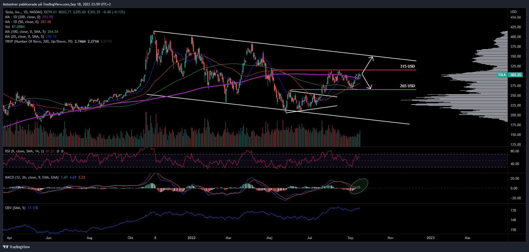 Tesla har gått starkt under de senaste två veckorna och har därmed lyckats notera sig över primärtenden som fortsatt har en svag negativ lutning. Som vi kan se i kursdiagrammet så bröt aktien norrut från den symmetriska triangeln vilket resulterade i en uppgång om cirka 25 procent mätt från utbrottsnivån. Sedan rekylerade aktiekursen tillbaka till 265 USD där stöd fanns och köparna visade sig vara köpglada vid denna prisnivå. I och med testet av 265 USD så bekräftades även MA 50 och 100 som stöd.
