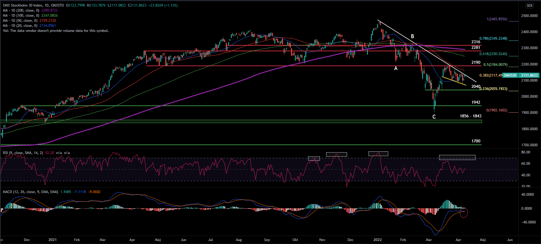 OMXS30 har sökt sig upp mot det fallande trendtaket men har hittills inte lyckats bräcka motståndet, i stället har det resulterat i lite mindre rekyler på nedsidan. Rekylerna har avslutats vid den gula linjen som fungerar som ett stöd. Värt att notera är det synliga gapet vid 2096 – 2120 har täppts igen och efter det så drog OMXS30 upp mot trendtaket igen. Om vi backar bandet lite så kan vi konstatera att vi en rejäl studs upp och en botten sattes precis över 1900 efter kraftiga rörelser intradag. Indexet retracade upp kraftigt och en uppgång på över 14 procent realiserades inom loppet av två veckor. Marknadsaktörer bevakade Fib 0,5 då det anses vara en nyckelnivå och många förväntar sig med andra ord någon form av prisrörelse. Vi kan nu i efterhand se att säljarna var starkare vilket betyder att mindre än 50 procent av fallet från all time high nivåerna har återhämtats. Fib 0,5 ligger vid 2184, utöver det finns det ett horisontellt motstånd vid 2190 och MA 50 låg strax ovanför. Man kan tänka att alla dess motstånd tillsammans utgör ett starkt motstånd.