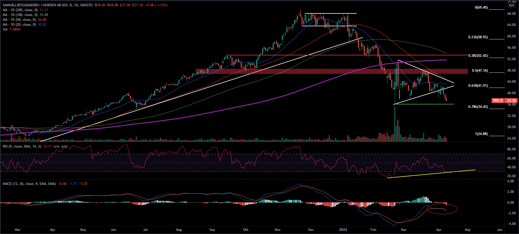 I diagrammet har jag dragit en Fib retracement från en signifikant lågpunkt, 25 SEK till all time high nivån kring 69,45 SEK. Vi kan se att aktien har fallit kraftigt och är ner cirka 46 procent från toppnoteringen. Kursen befinner sig under samtliga glidande medelvärden och har på sin väg ner även brutit under tidigare viktiga stödnivåer. Vi kan se en prisformation i form av en triangel där kursen bröt ut söderut, i samband med utbrottet togs även Fib 0,618 och enligt mig är siktet inställt mot tidigare lågpunkt vid 36 SEK. Vid den nivån finns det potential till att forma en bottenformation i form av en dubbelbotten. Om denna nivå inte håller finns det risk för tilltagande kursfall. Enligt handelsmönstret skall en ny lägre botten sättas, det återstår dock att se om det blir utfallet.