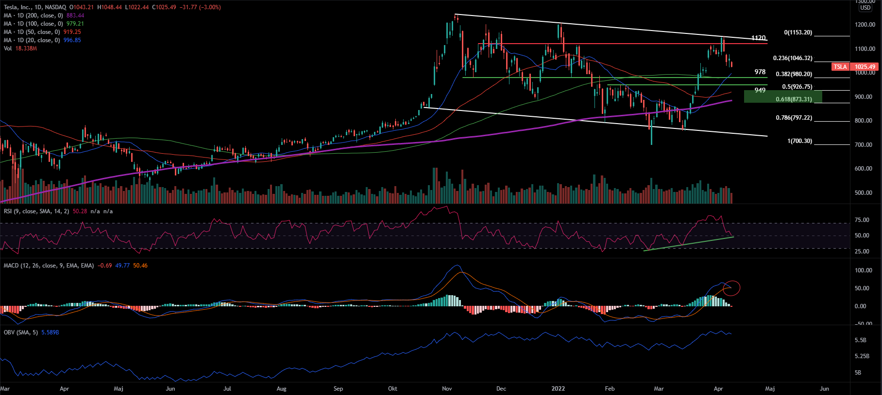På nedsidan finns det ett gäng stödnivåer, de två tydligaste horisontella stödnivåerna finns vid 978 respektive 949 USD. Utöver dessa så befinner sig MA 20 cirka 2 % under fredagens stängningskurs och strax under ligger MA 100 flat. Primärtrenden är fortsatt stigande och är rätt hälsosamt stretchad från aktiekursen, med det sagt så är den långsiktiga trenden fortsatt positiv. Dock kan man argumenterar för att trenden inte är lika positiv på medellång sikt givet den fallande trendkanalen. I grafen har jag dragit en Fib Retracement från 700 upp till 1153 USD som motsvara den signifikanta låg- och höjdpunkten i den senaste prisrörelsen. Vi ser att Fib 0,5 och 0,618 sammanfaller strax under de horisontella stöden. Om de stöden inte håller finns det nog god chans att köparna kommer tillbaka mellan Fib 0,5 och 0,618. Det ser även ut som att primärtrenden kommer fortsätta stiga upp mot de nivåerna och därmed utgöra ett ännu starkare stöd. Om Fib-nivåerna skulle brista talar det för att Tesla ska ner mot trendgolvet.