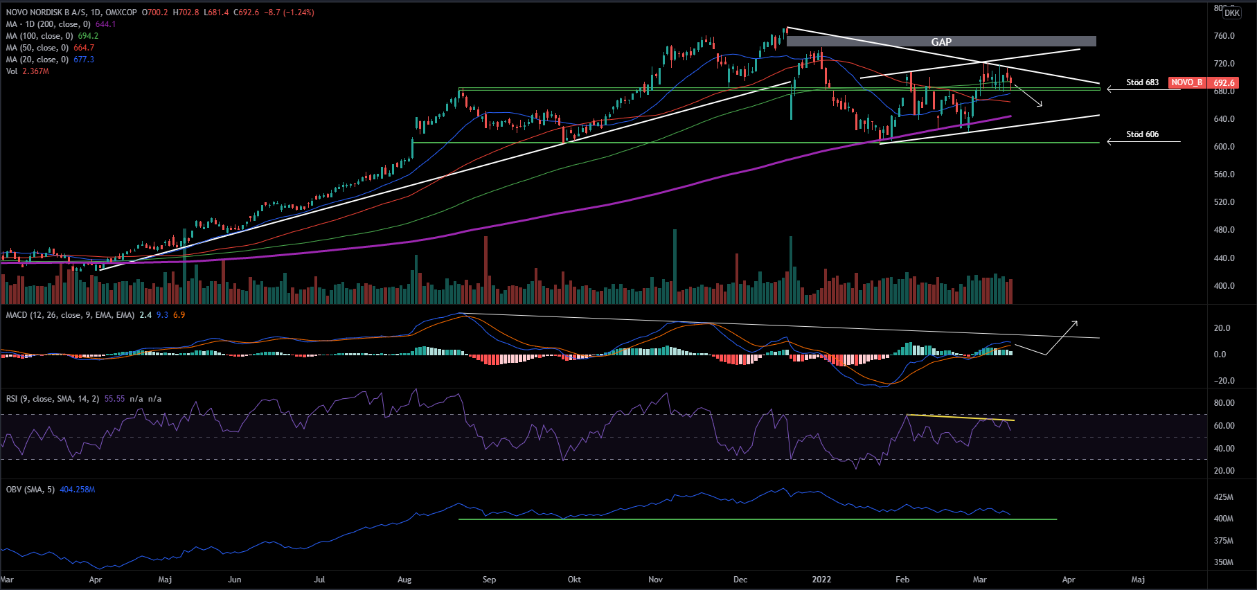 Det historiska handelsmönstret talar för att Novo Nordisk skall ner och testa av primärtrenden som just nu har en positiv lutning och återfinns närmare trendgolvet. I fredags stängde aktiekursen strax under MA 100, på nedsidan hittar vi först MA 20 och därefter MA 50. Den långsiktiga trenden är fortfarande intakt, dock kan man argumentera för att en lägre topp har printats nu och läget framgent skulle kunna bli kritiskt om det är så att en lägre botten printas härnäst.