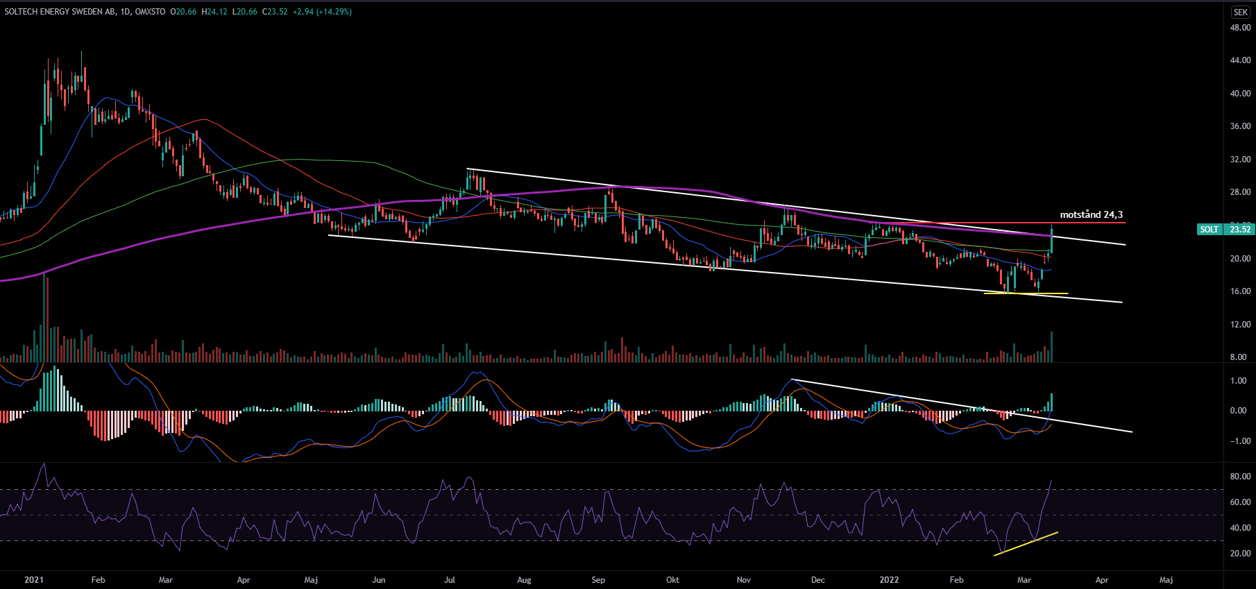 Soltech hade det tufft inledningsvis under 2022 och var ner som mest närmare 35 procent sedan årsskiftet. Den bilden har dock förändrats drastiskt och Soltech är en av de få First North-bolag som ligger på plus i år. Som vi kan se i grafen har aktiekursen befunnit sig i en nedåtgående trend där nya lägsta toppar följs upp av allt lägre bottnar. Under stor del av tiden har samtliga glidande medelvärdena fungerat som motståndsnivåer vilket över tid har tryckt ner aktien ytterligare. I fredags steg aktiekursen över 14 procent, uppgången innebar att stängningskursen landade ovanför MA 200 samt över det fallande trendtaket. Uppgången representerade även av stark volym, totalt omsattes närmare 2,5 miljoner aktier vilket är den största handelsvolymen sedan januari i fjol. Dessa typer av utbrott kan vara värda att hänga med på men det kan vara värt att invänta ett återtest eller att skala in sig över tid. Just nu är det kortsiktigt överköpt, aktien har avancerat närmare 43 procent under den föregående veckan och det är inte orimligt att ett sell-off sker under veckan. Jag är dock positiv till denna setup, primärtrenden har tidigare fungerat som ett starkt motstånd och stängningen ovanför denna nivå tillsammans med stark volym talar för vidare uppgång, i alla fall enligt mitt sätt att se på det.