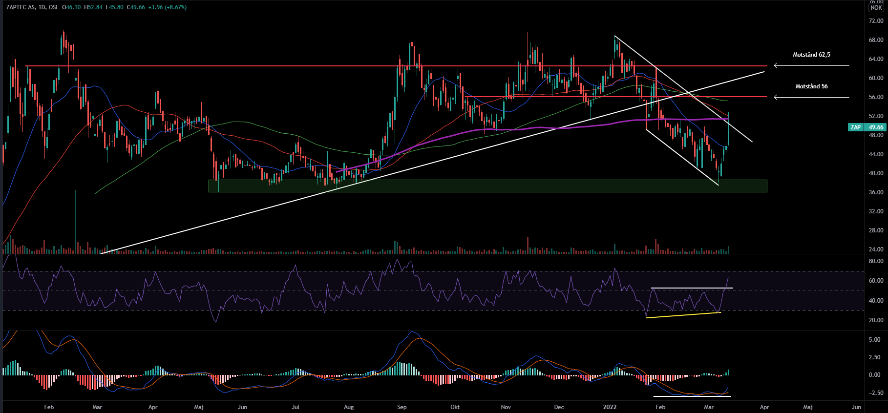 Denna vecka tittar vi närmare på den tekniska biten för norska Zaptec, danska Novo Nordisk och svenska SolTech Energy. Deras prestation i år varierar rent avkastningsmässigt men ingen av de har tagit en allt för stor smäll som följd av Ryssland-Ukrainakrisen. Kriget fortsätter tyvärr att ha en väldigt tråkig utveckling, dödsantalet ökar för varje dag och fler ukrainare tvingas fly sitt land. Som följd är börsen fortsatt volatil samtidigt som CPI (Consumer Price Index) kom in på 7,9 % (mat och energi är inkluderat). Med andra ord spökar inflationen fortsatt och det är väldigt vanskligt att sia hur kriget kommer påverkar den globala ekonomin på längre sikt.